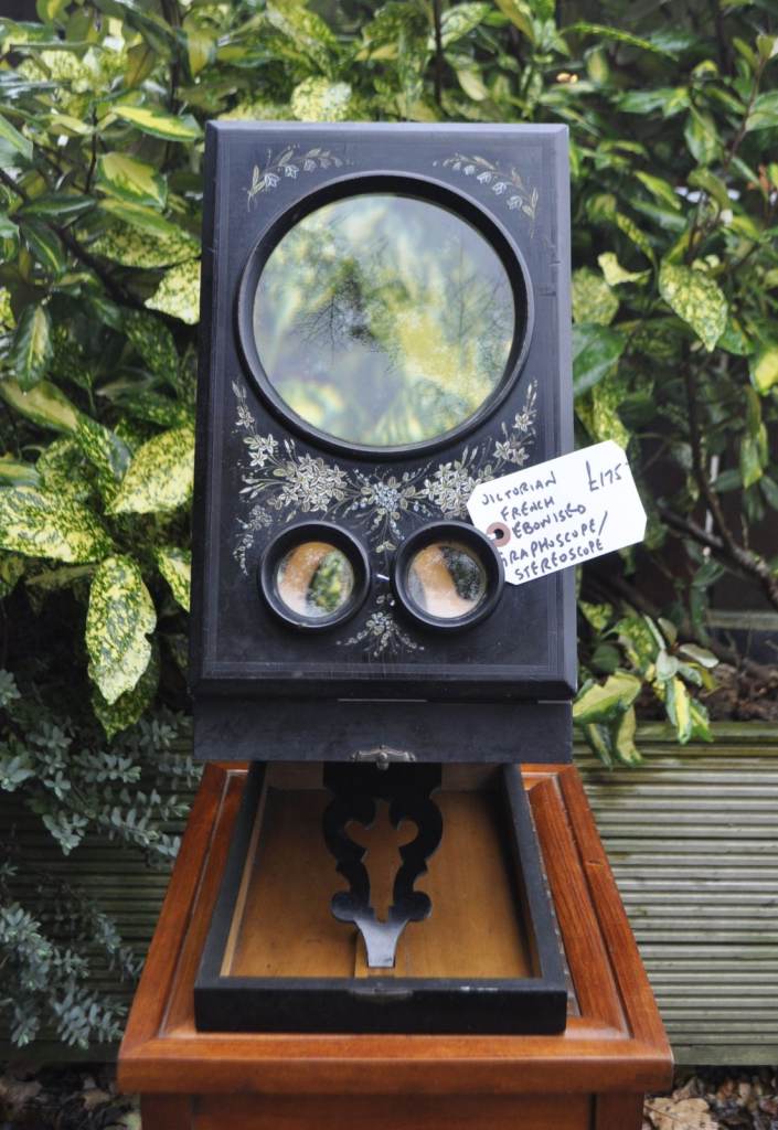 In exceptional condition given its age & type, Victorian French ebonised graphoscope / stereoscope, closes down to approx. 14 inches wide, 8 inches deep, 4 inches high. £175, no slides, readily available online, various subjects. Collection only from Wolsingham.