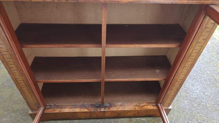 This is a beautiful Victorian inlaid burr walnut display cabinet. Its in good sturdy condition for its age there are some age related wear but as to be expected for its age. The inside is lined with a suede material. It’s 110 cms wide 35 cms deep and 108 cms tall. Collection is from Pontprennau easy access collection only !