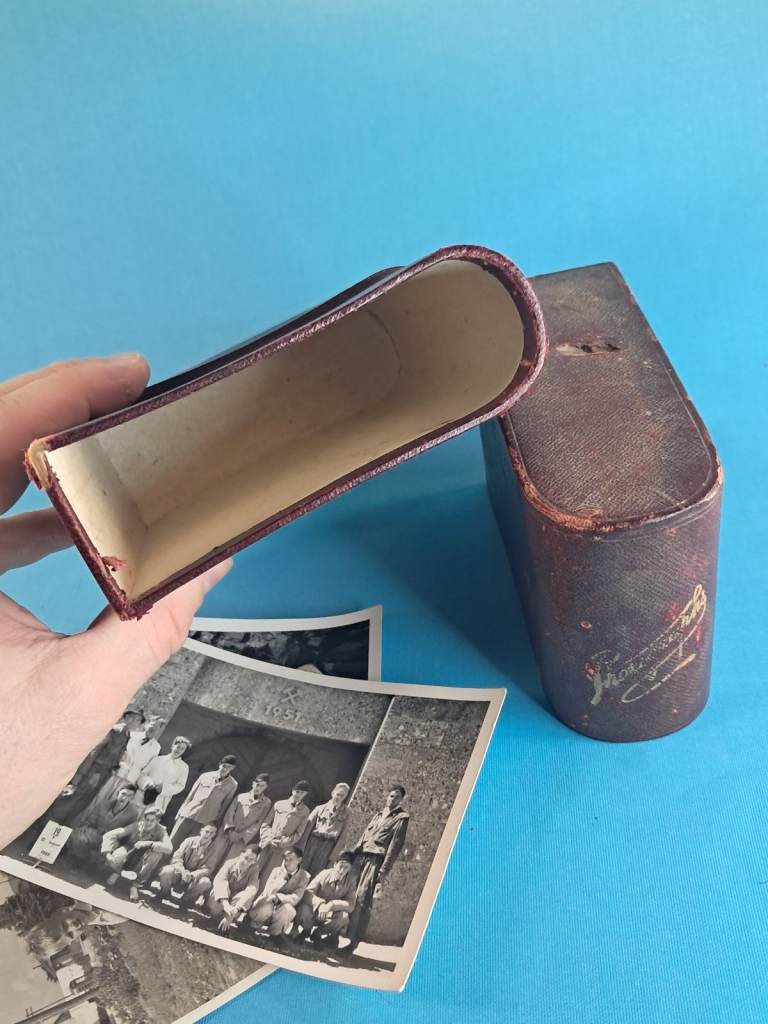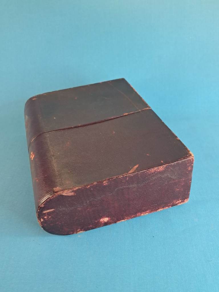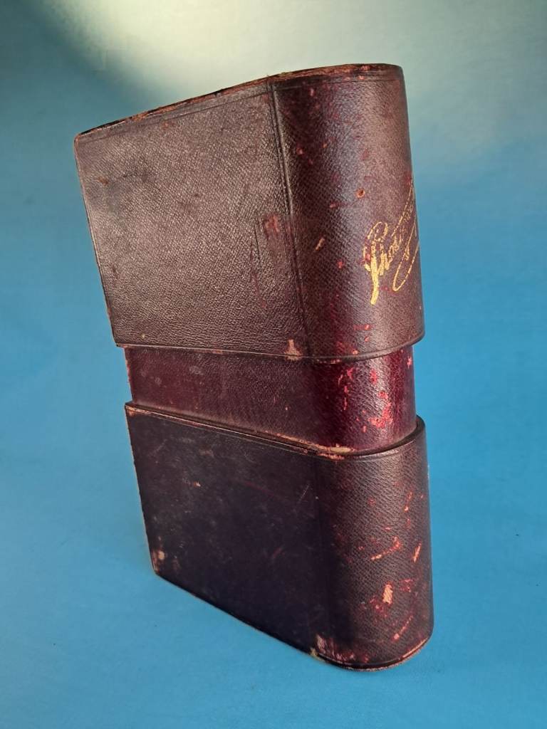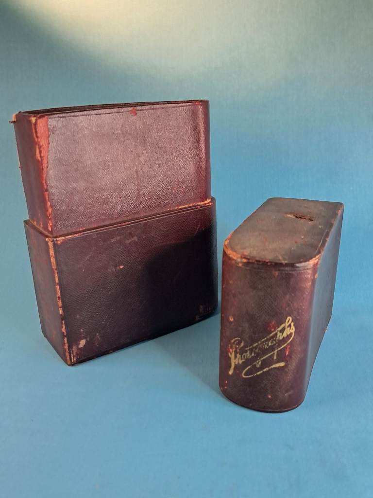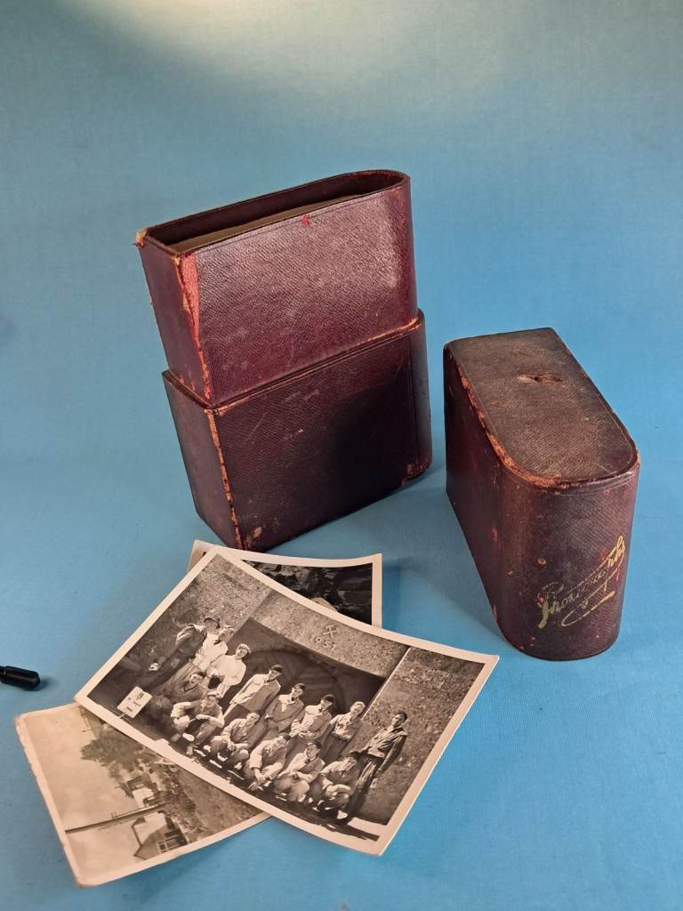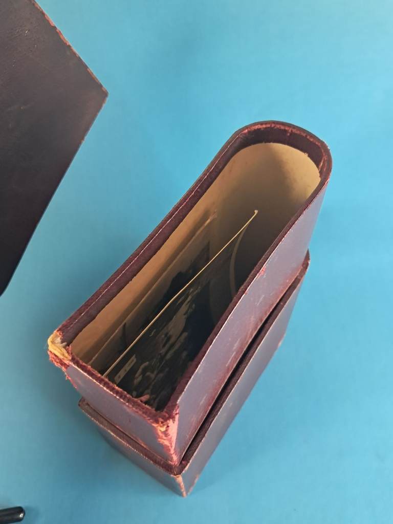 Victorian photograph box to store and hold the cabinet card photographs that were very popular in the late 19th century. The box is covered in red leather with gilt writing to the curved front 'Photographs'. There are a collection of 3 postcards in the box.