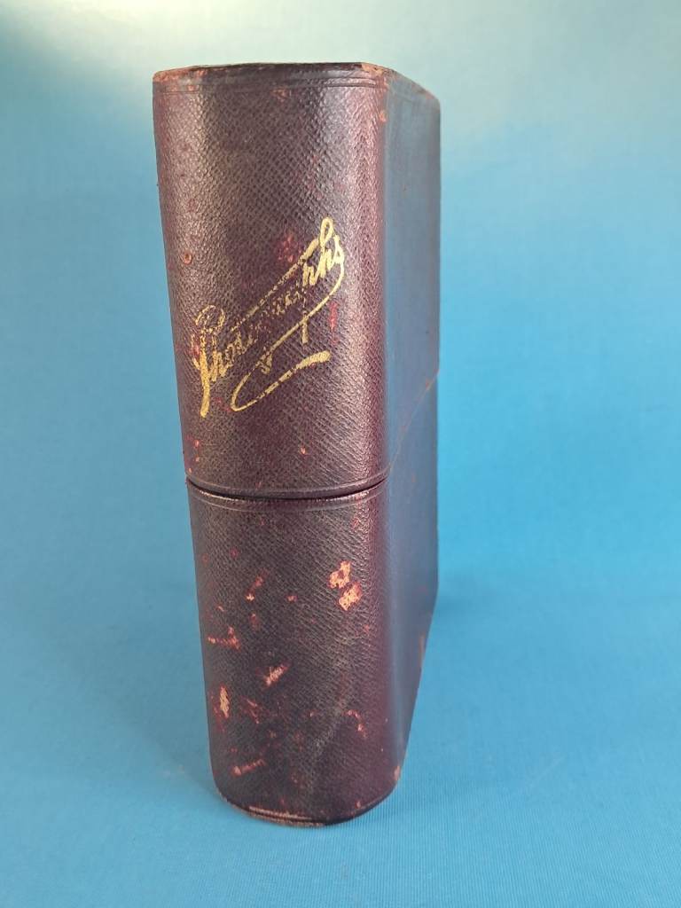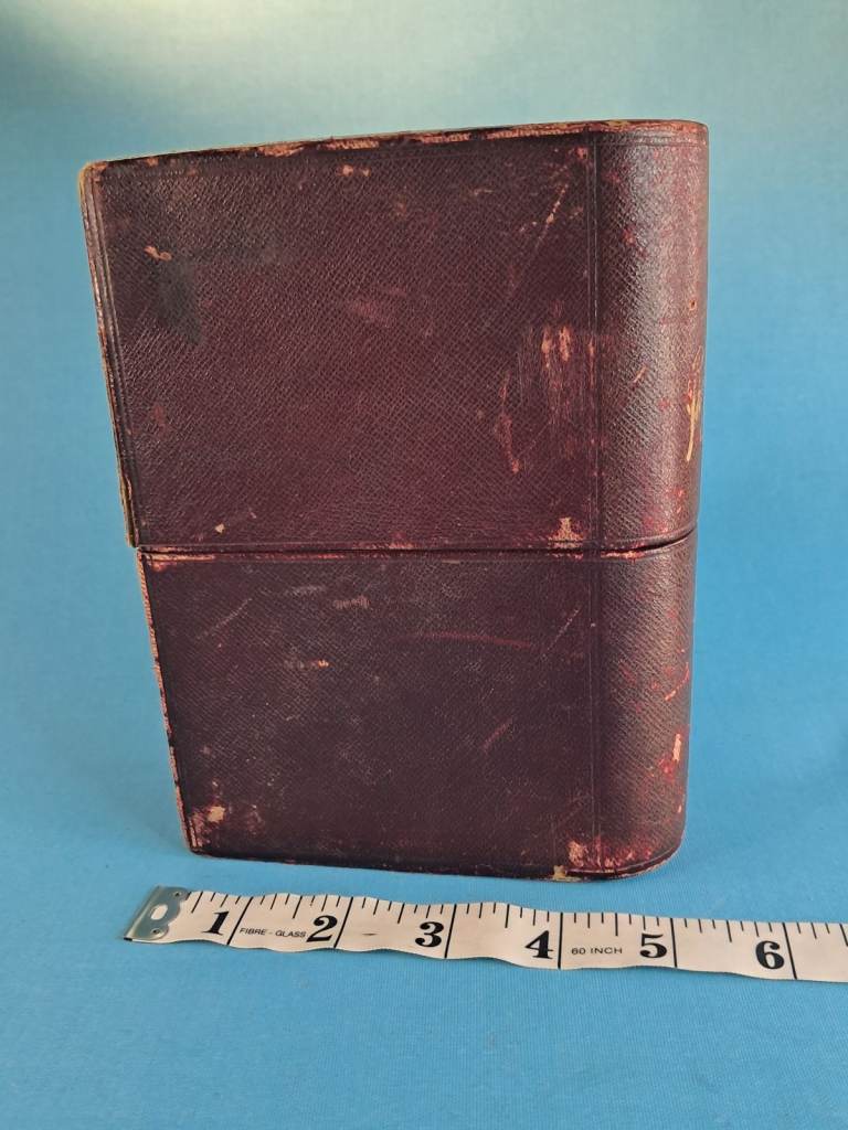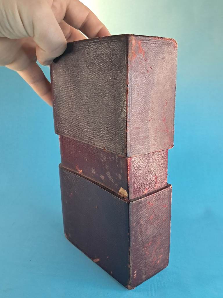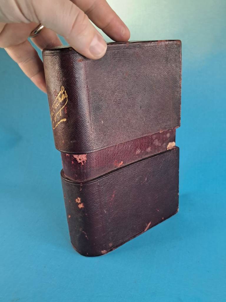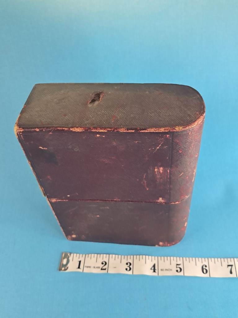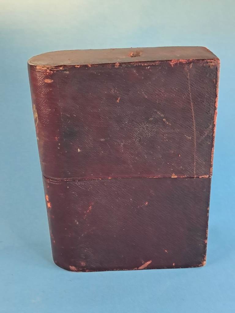 Victorian photograph box to store and hold the cabinet card photographs that were very popular in the late 19th century. The box is covered in red leather with gilt writing to the curved front 'Photographs'. There are a collection of 3 postcards in the box.