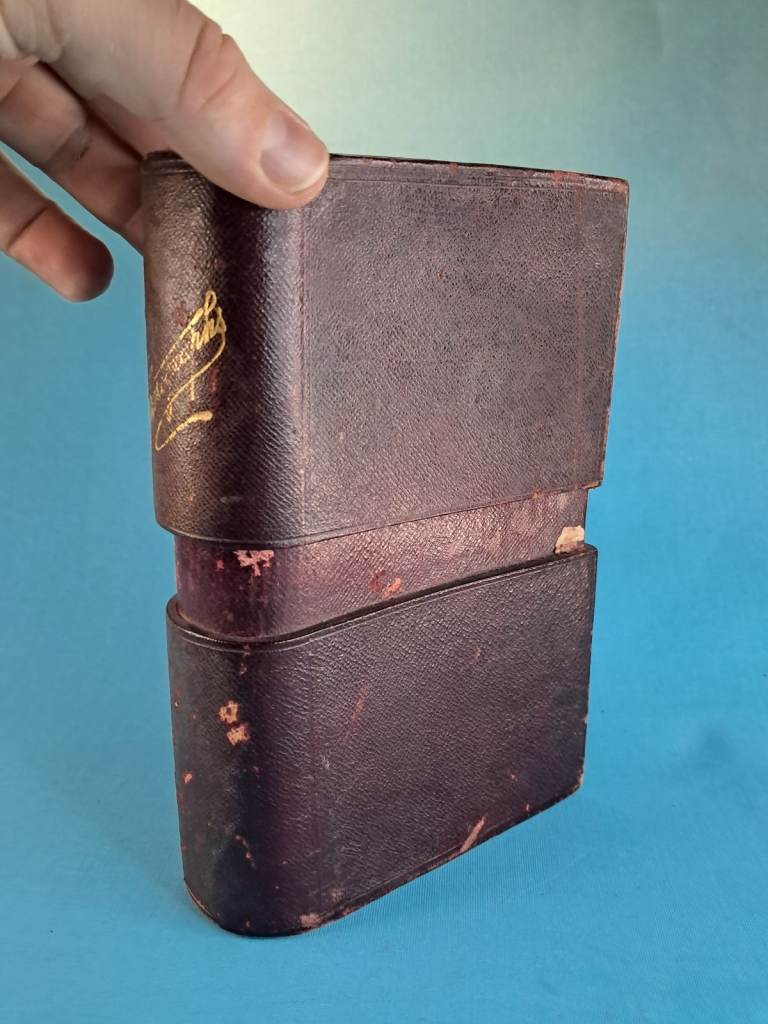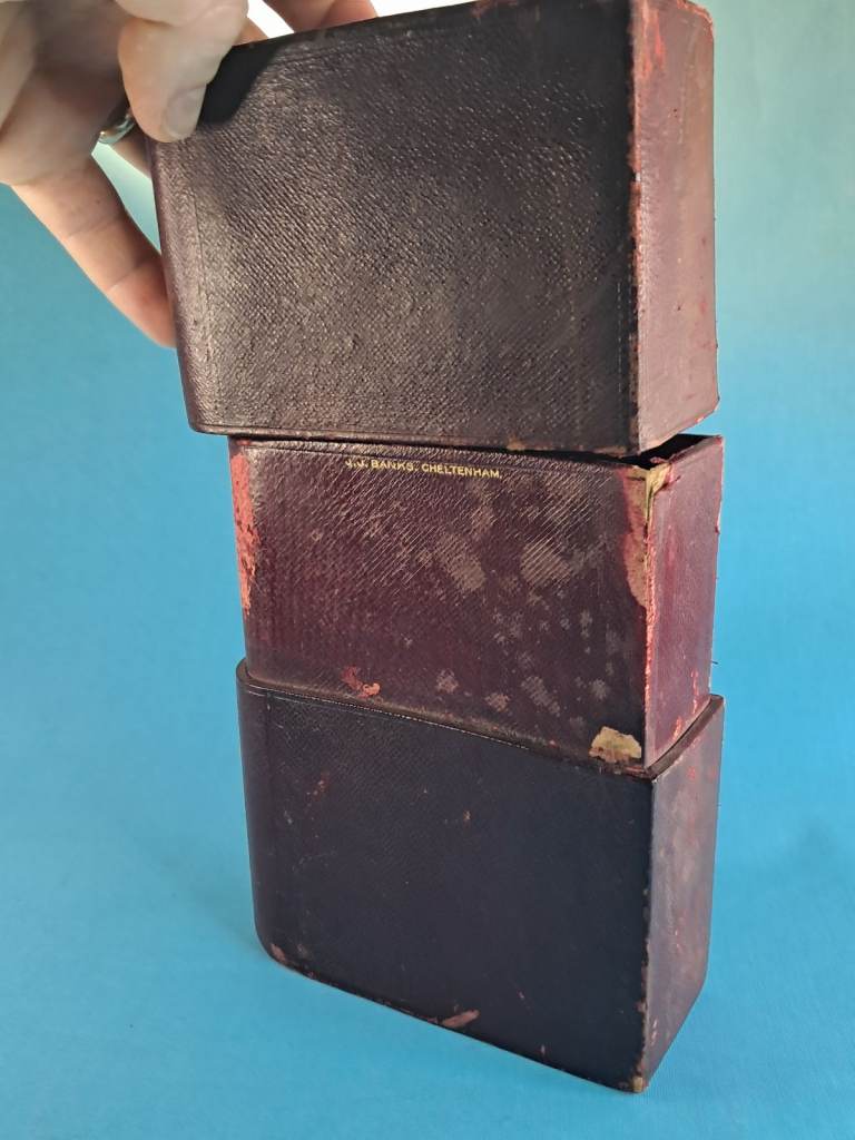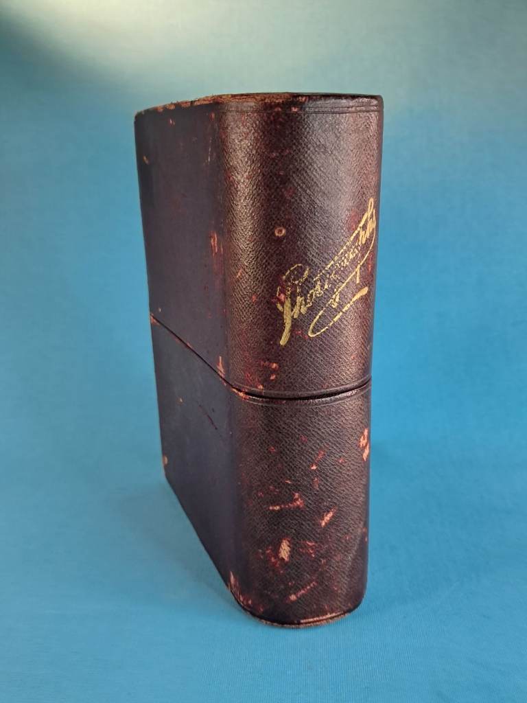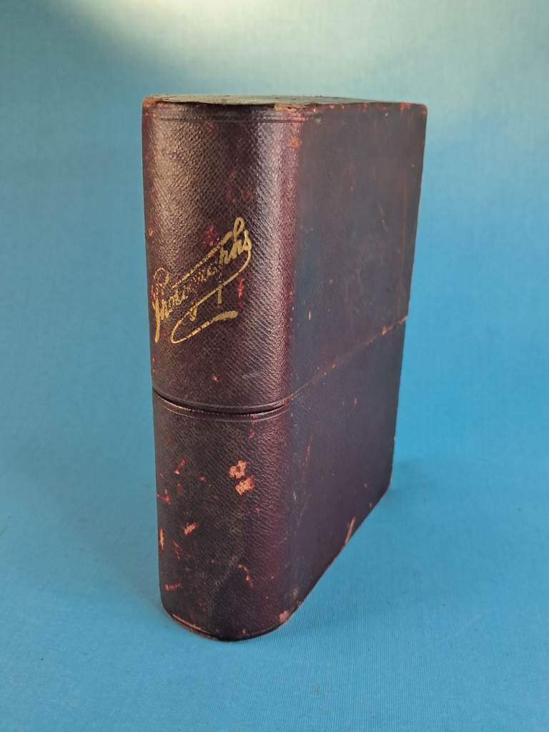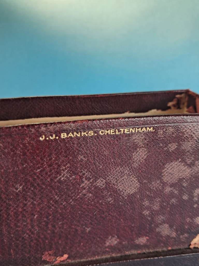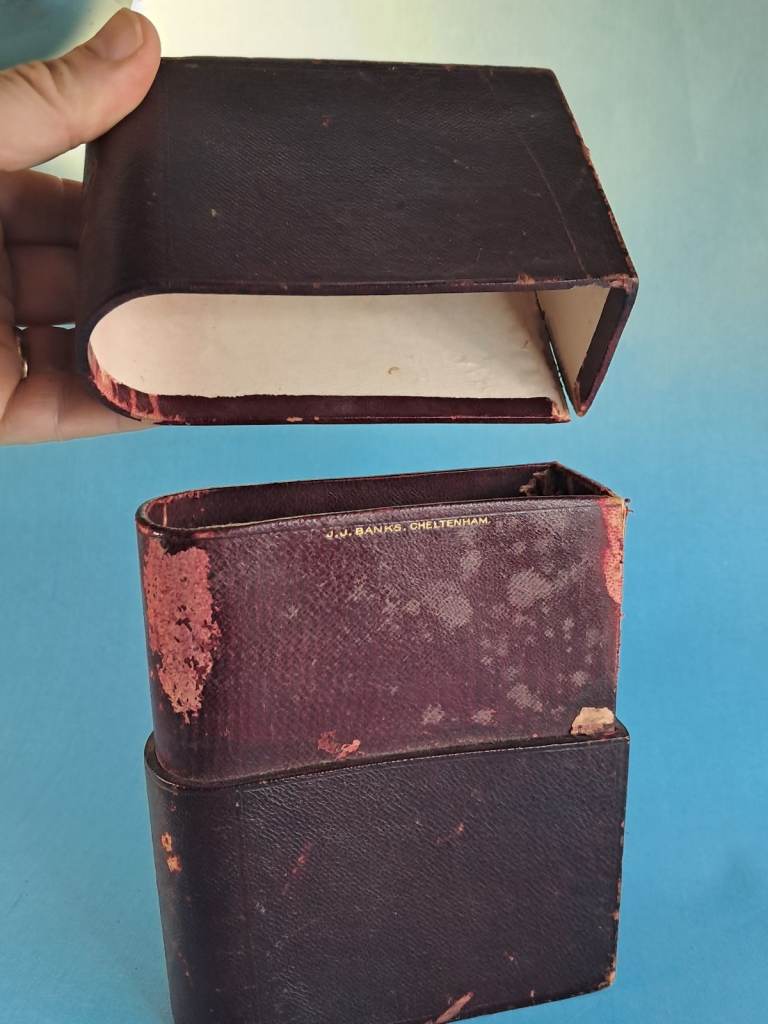 Victorian photograph box to store and hold the cabinet card photographs that were very popular in the late 19th century. The box is covered in red leather with gilt writing to the curved front 'Photographs'. There are a collection of 3 postcards in the box.