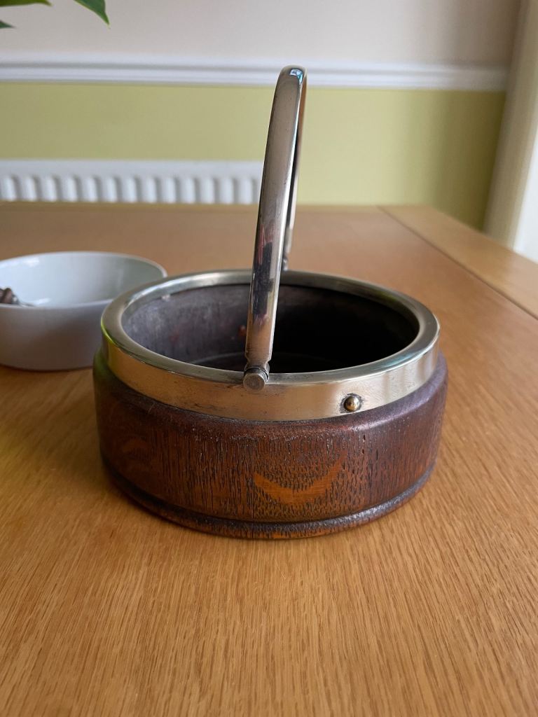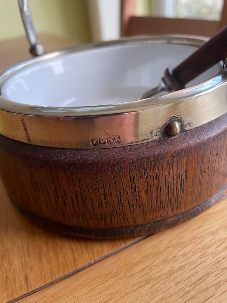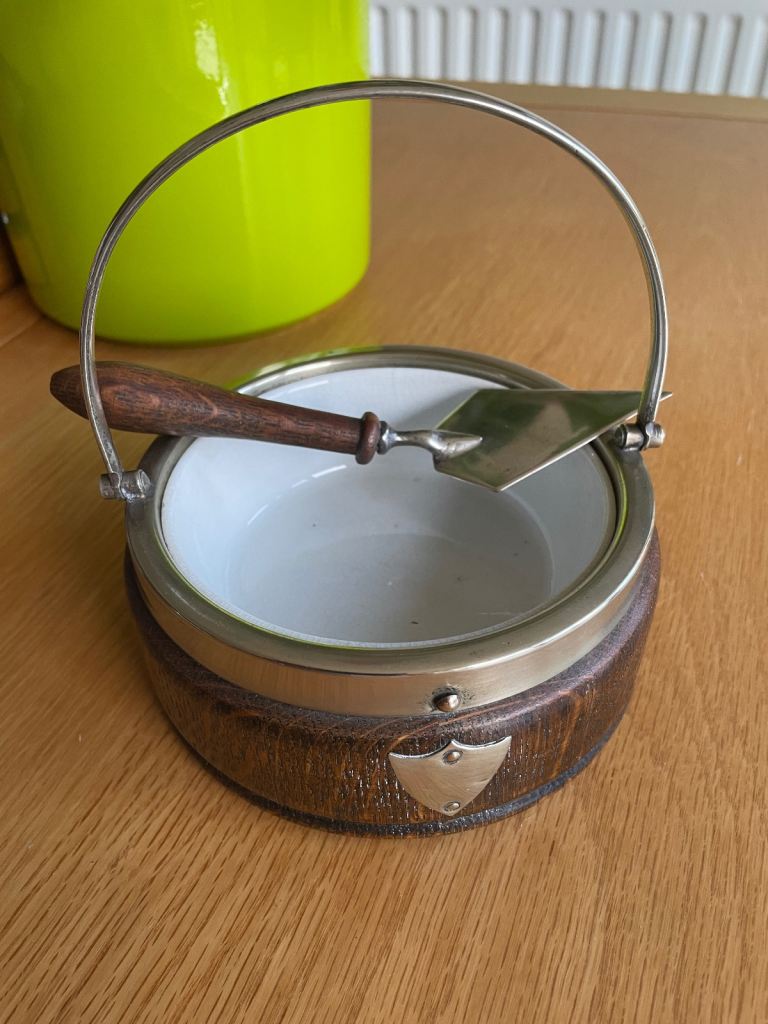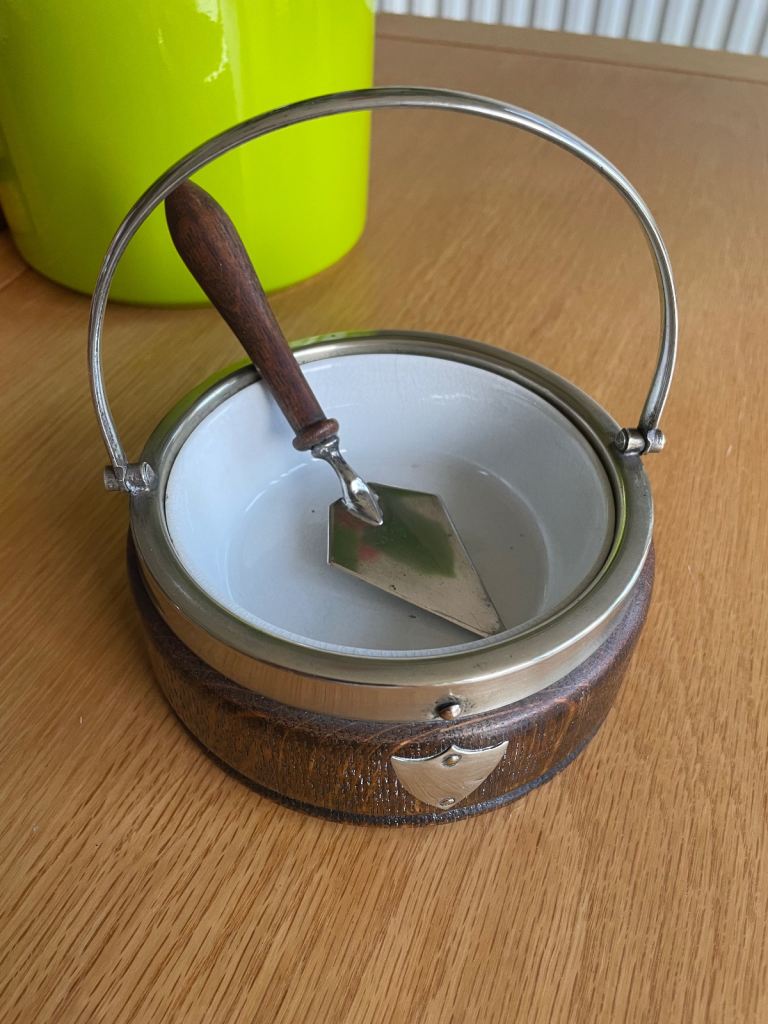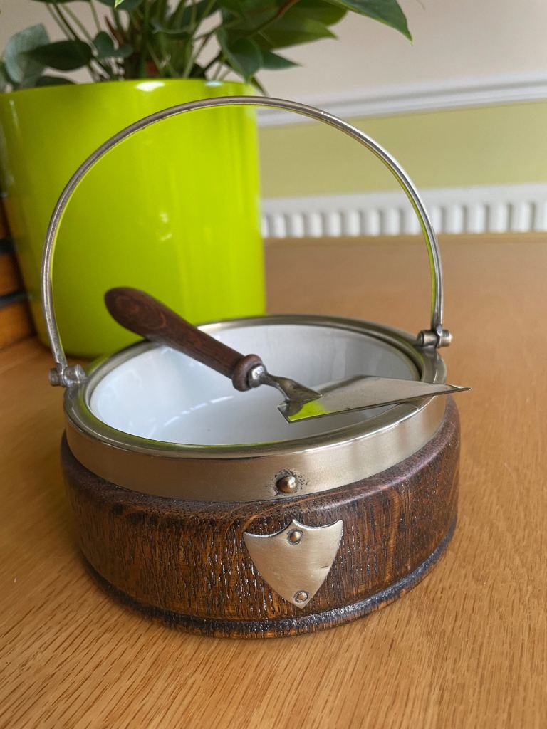 Collectible Vintage c.1930/40's butter or cheese serving dish with handle and serving spade. Silver plated and solid wood. The ceramic dish is showing signs of age but is in very good condition. Can be used on the dining table or just kept as an ornament. Very good condition for its age.