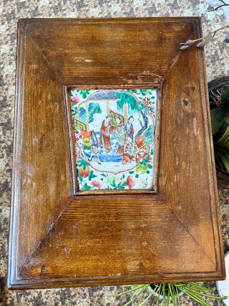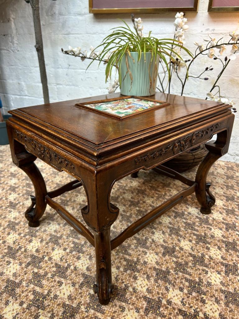 Vintage Chinese Carved Wooden Table with Ceramic Tile Inlay