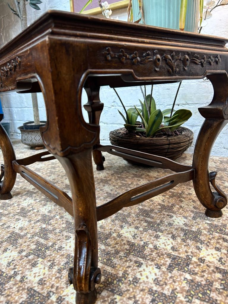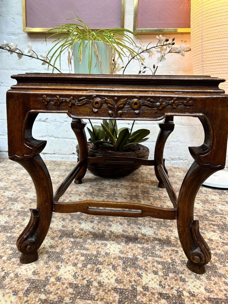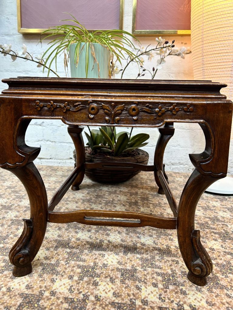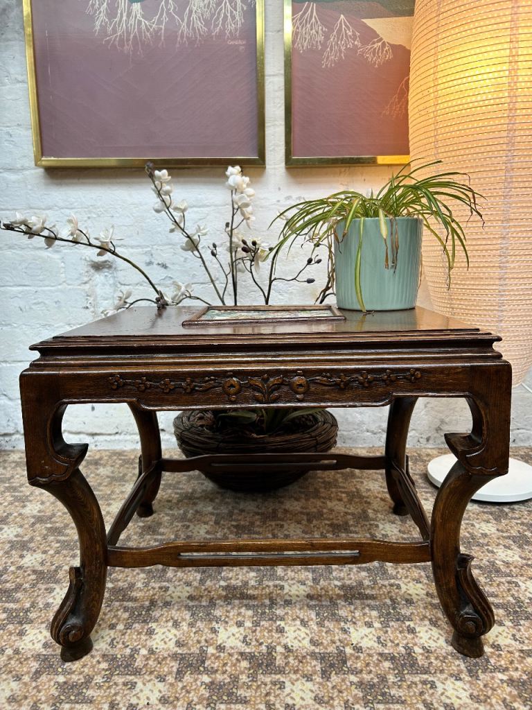 Lovely vintage Chinese wooden table, likely a coffee or side table, with beautiful hand-carved detailing.