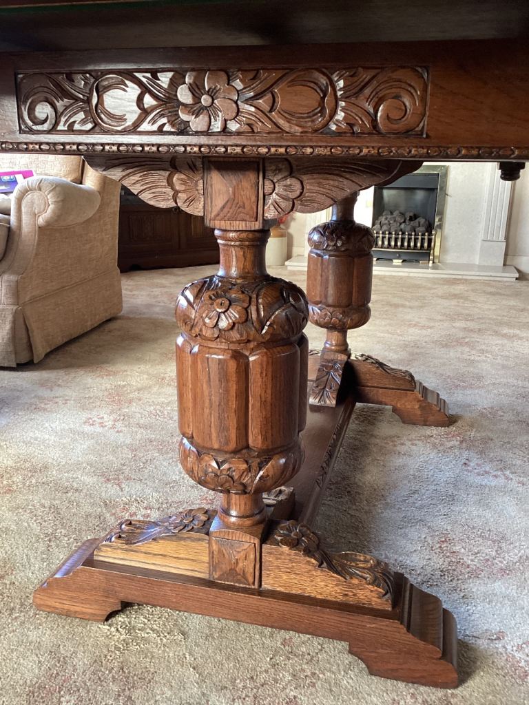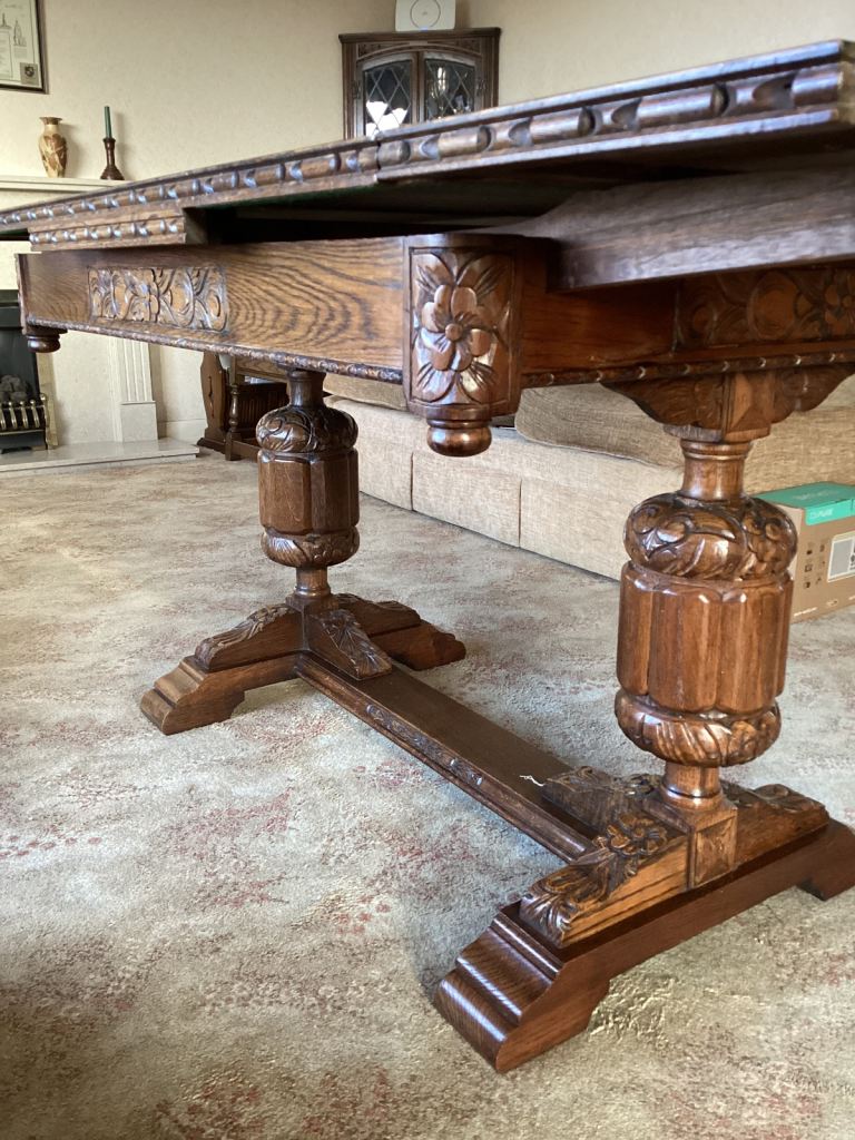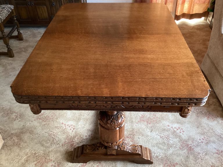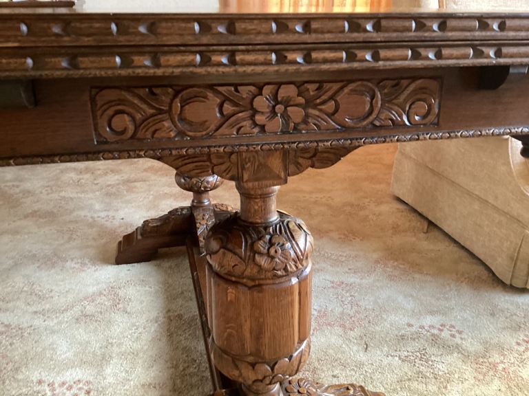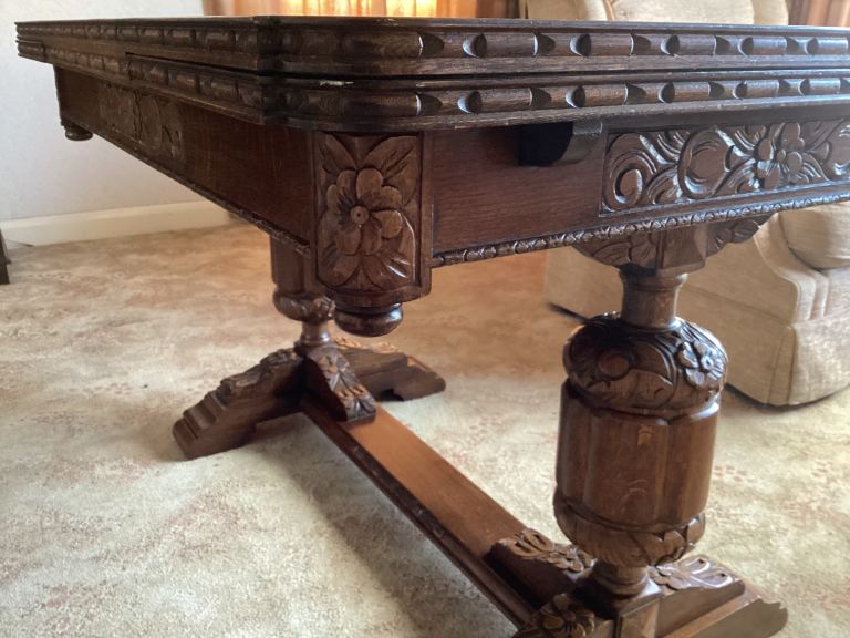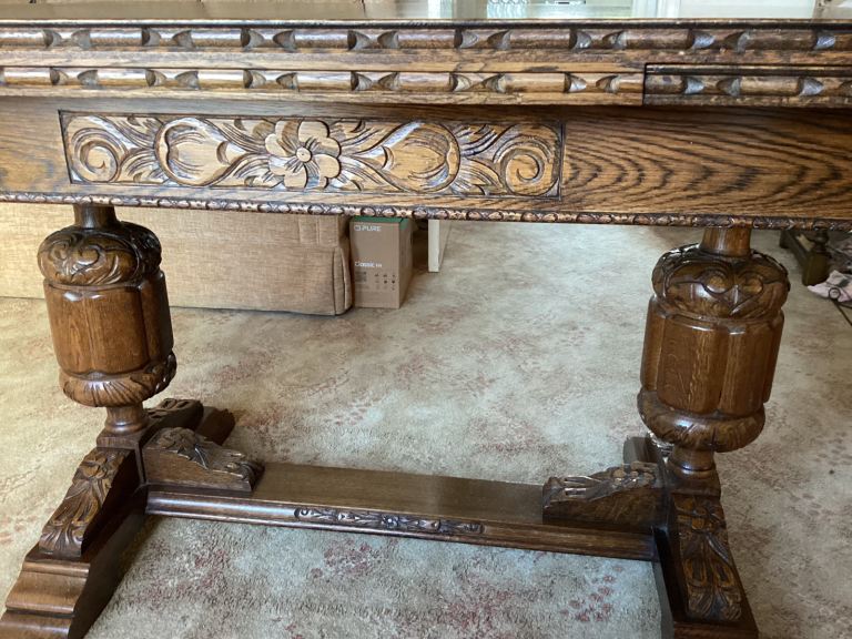 Beautiful heavily carved 4’ (extends to 6’) x 3’ Draw Leaf Table , height 31”