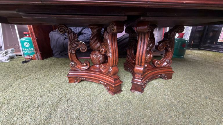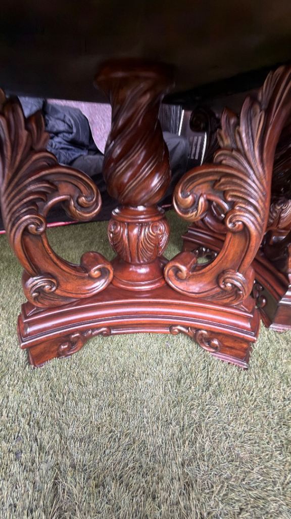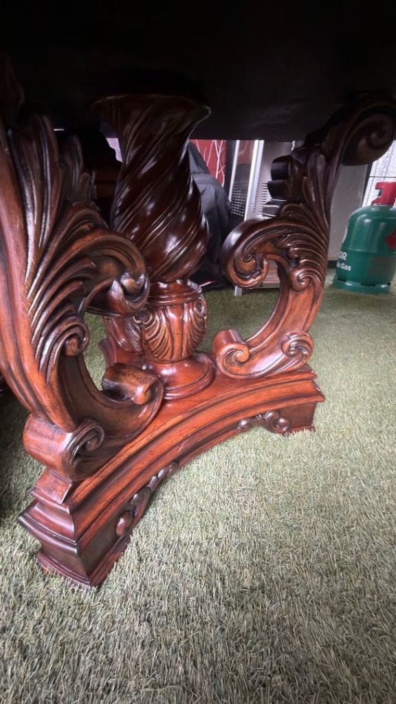 Beautiful statement dining table in a classic traditional style with a highly detailed carved pedestal base.