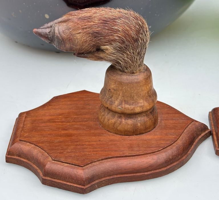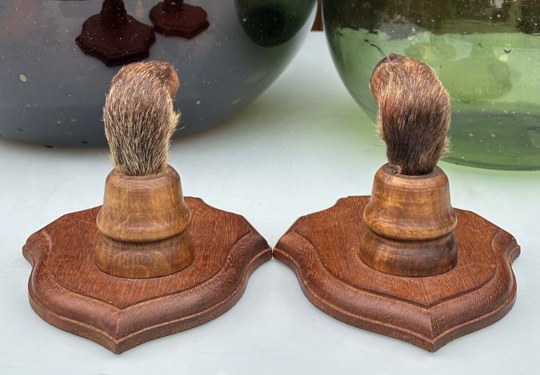 Made from two Wild Boar, or Sanglier in French, hooves attached to curved oak shield plaques they are worn but still very sound.