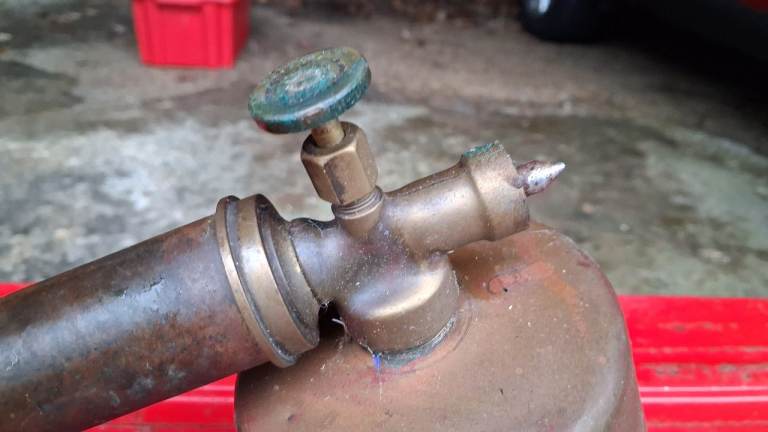 Old brass garden sprayer, looks like a good restoration project or display piece.