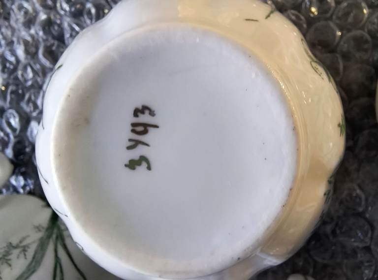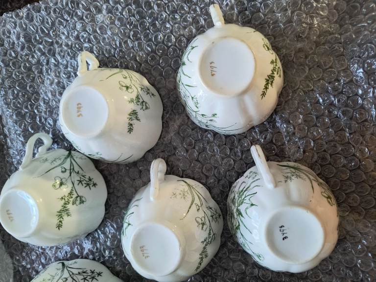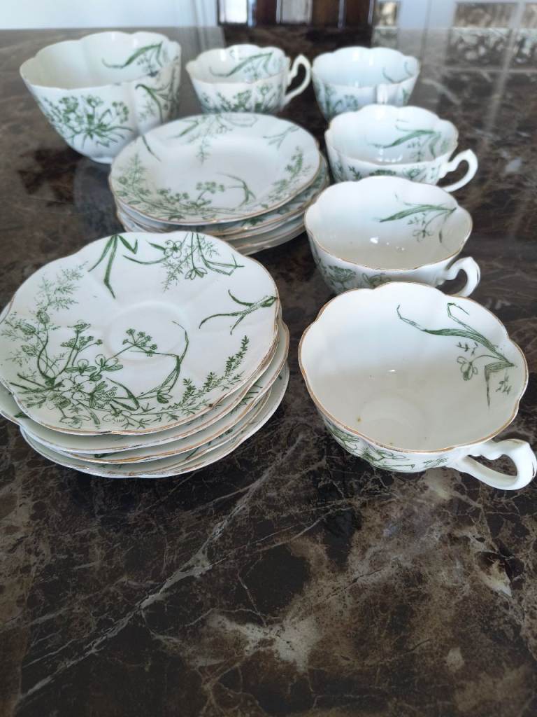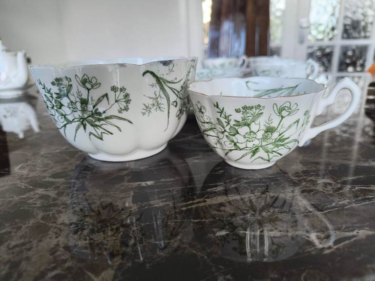 Vintage green and white china floral tea set. Includes 5 cups, 5 saucers, 6 side plates and a sugar bowl.
