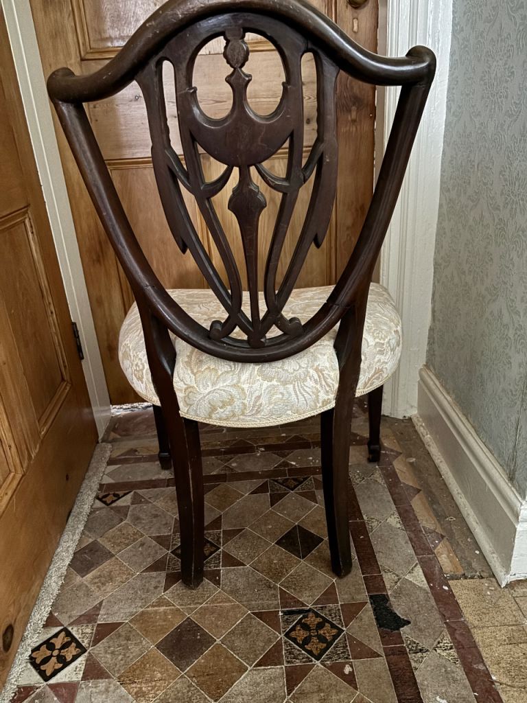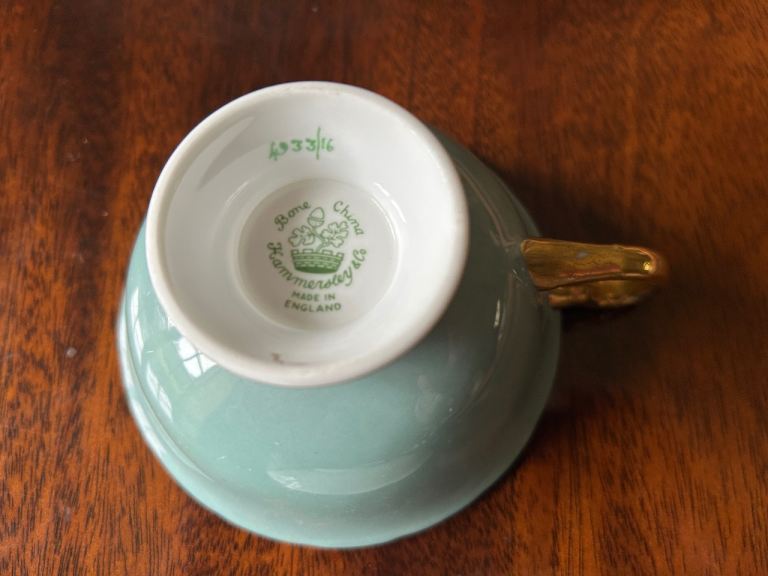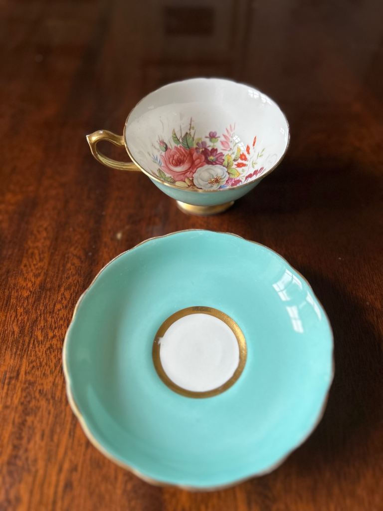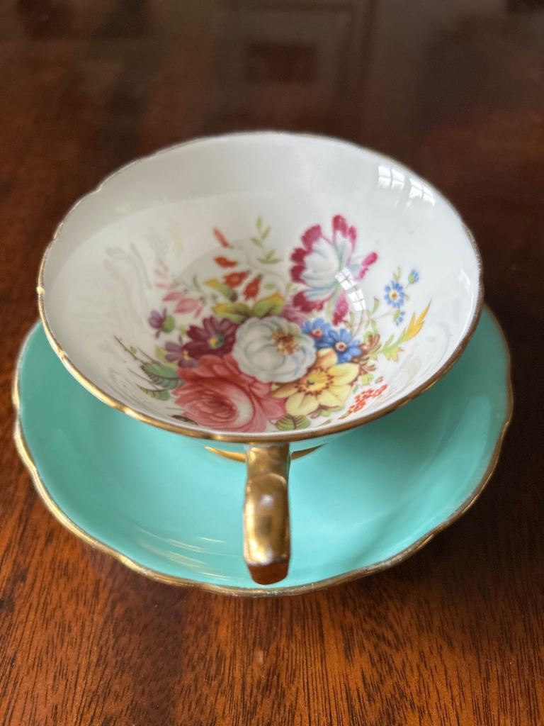 Vintage Hammersley bone china teacup and saucer set. Pale green saucer and cup exterior, with beautiful floral pattern inside the cup. Gilt edging on saucer and cup, very slightly worn.