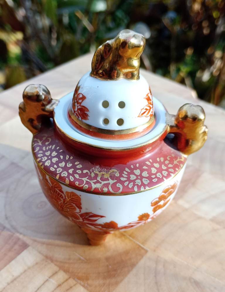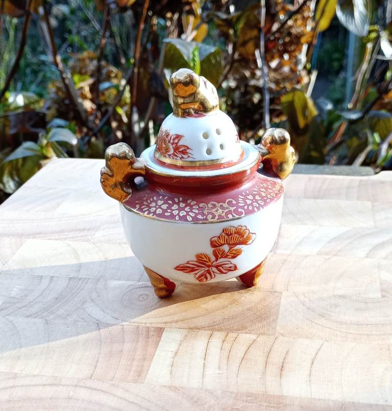 Vintage Japanese Porcelain Small Incense Burner (Koro) With Gold Foo Dog Finials