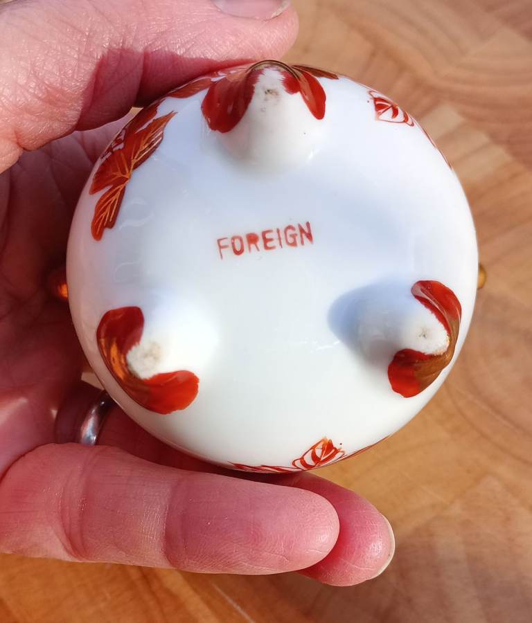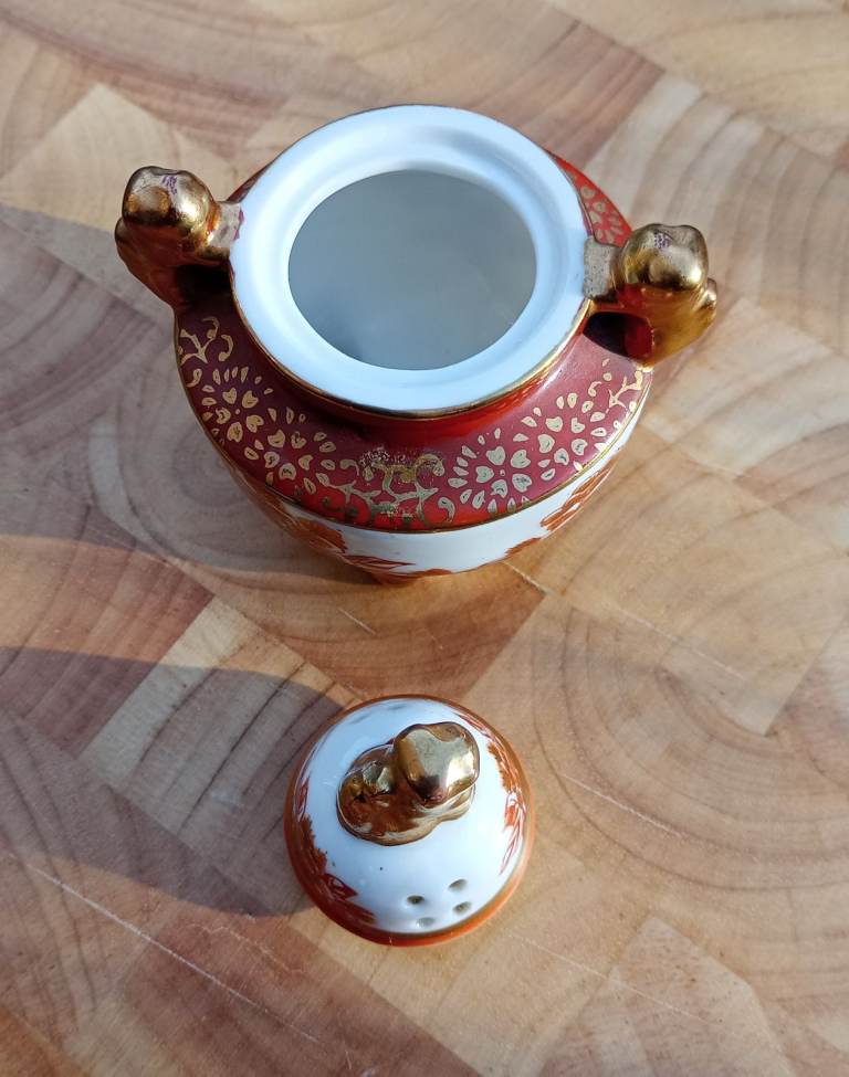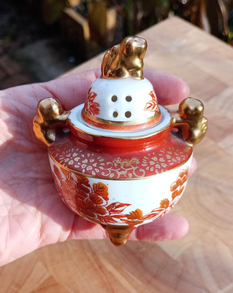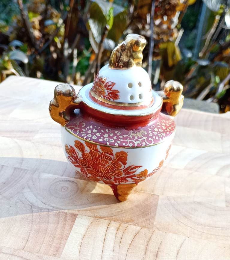 This is a gorgeous Vintage Japanese Porcelain Small Incense Burner (Koro) With a Gold Foo Dog Finial and handles. It has red, orange and gold hand painted floral decoration . It has a domed lid with ventilation holes to allow incense smoke to leave. It has 'Foreign' marked on the base usually indicating it is a Japanese export from the early 20th century. It is in a good condition with no chips or cracks, it is a vintage item so has a few signs of age. please see photos.