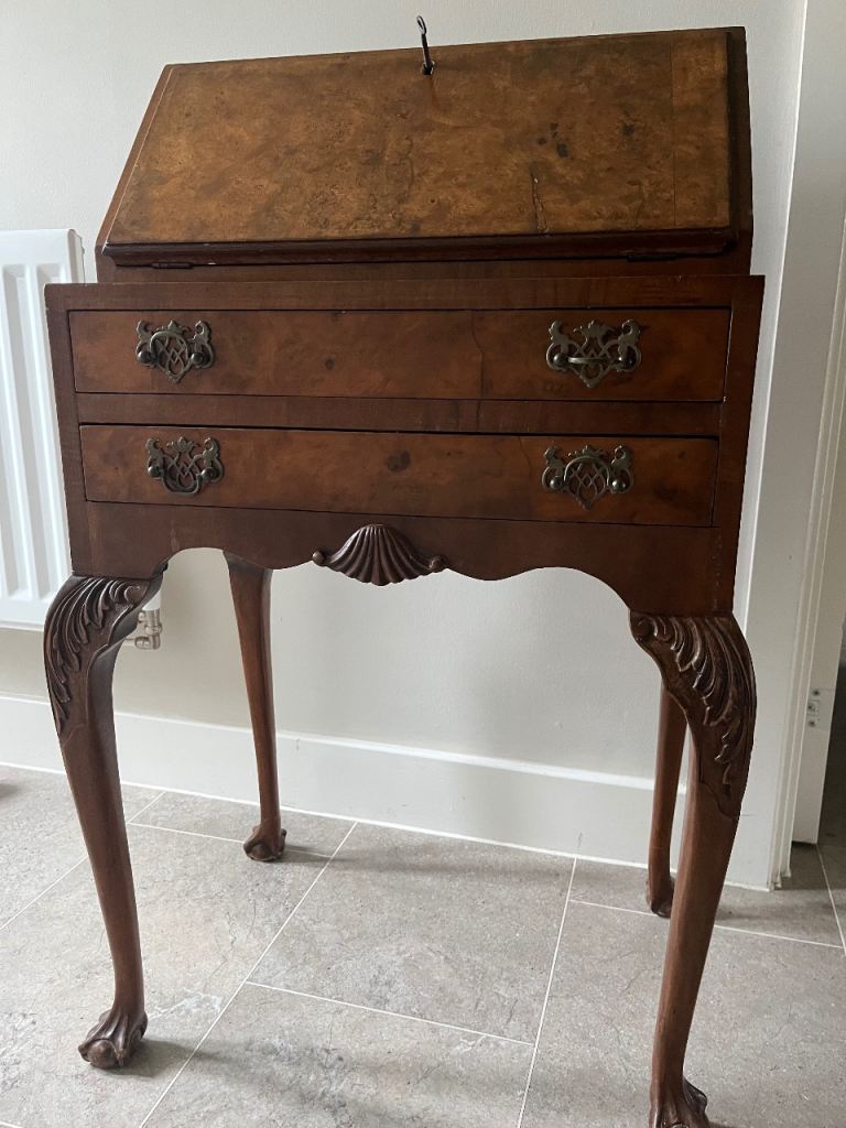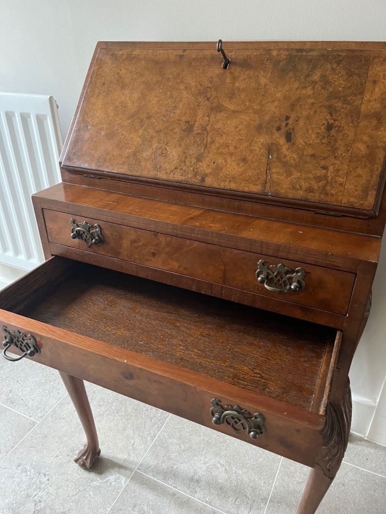 This is a solid, well-made piece with a fold-down writing desk, internal compartments, and multiple drawers for storage. Comes with the original key and working lock.