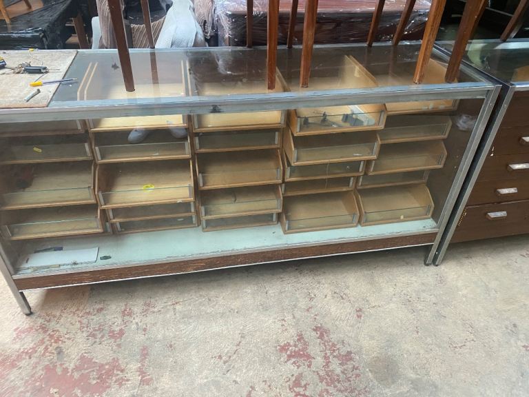X 2 MIDCENTURY TEAK AND STAINLESS STEEL HABERDASHERY SHOP COUNTERS ,OVERALL CONDITION IS VERY GOOD ,VERY ORIGINAL ,BOTH CABINETS WILL BE CLEANED PRIOR TO DELIVERY ,ONE CABINET HAS HANDLE MISSING ON ONE DRAWER EVERY THING ELSE IS INTACT