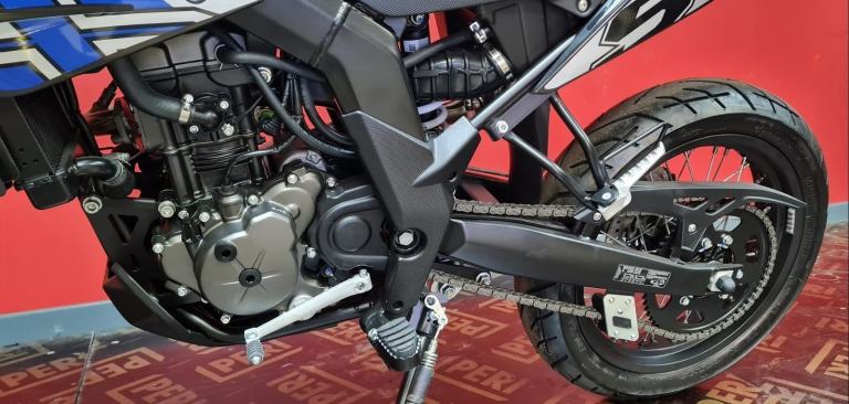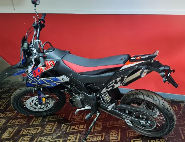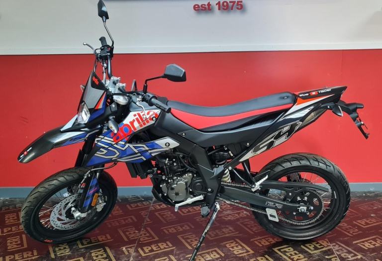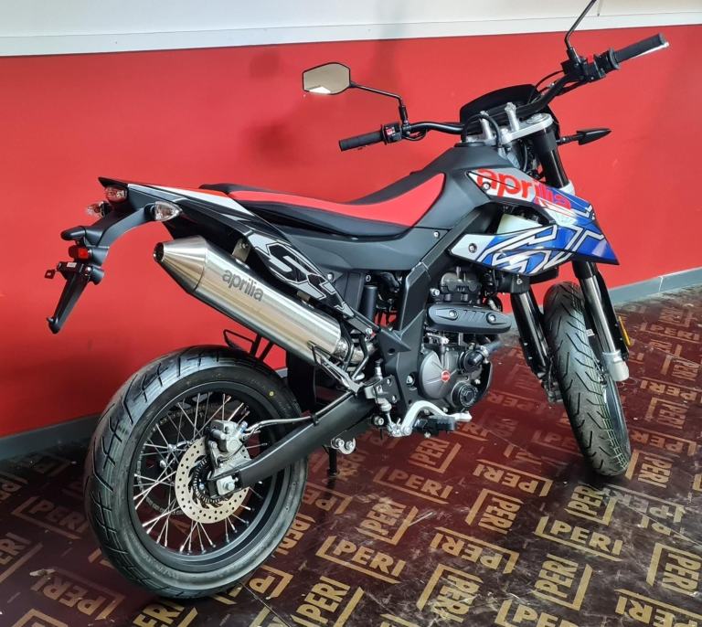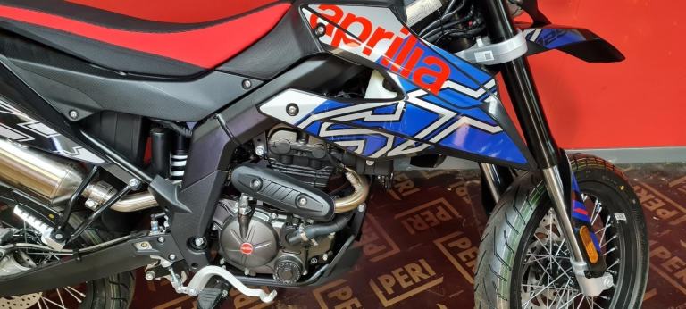 The supermoto Aprilia SX 125 uses the RS 125’s fuel-injected, four-stroke, single cylinder engine that is housed in a steel double cradle frame. Boasting inverted forks, ABS, and smatterings of real-fake carbon fibre, not to mention typically-Aprilia aggressive styling, it looks a far more premium product than the price tag suggests. The SX 125 has a ‘big bike’ feel about it and while the seat height is quoted at 880mm, it’s such a narrow machine with soft suspension that in reality it’s far lower. The riding position is relaxed with tall bars and it’s as fast as any four-stroke 125 with solid road holding meaning you can happily top 60mph, which is all you need. The SX is impressive value for money The aggressive look and relaxed riding position that a supermoto style of bike delivers is good and the fact the SX comes with ABS is a bonus.