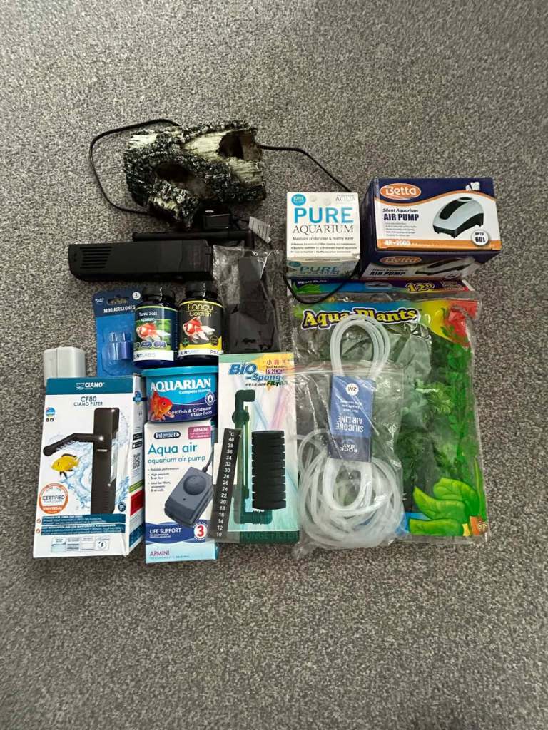 2 ciano filters, bio sponge, 2 air pumps, air stones, plants, ornament, food etc