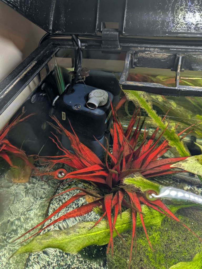 It comes with a filter, heater, air pump (Love Fish brand), lighting, and various decorations/plants.