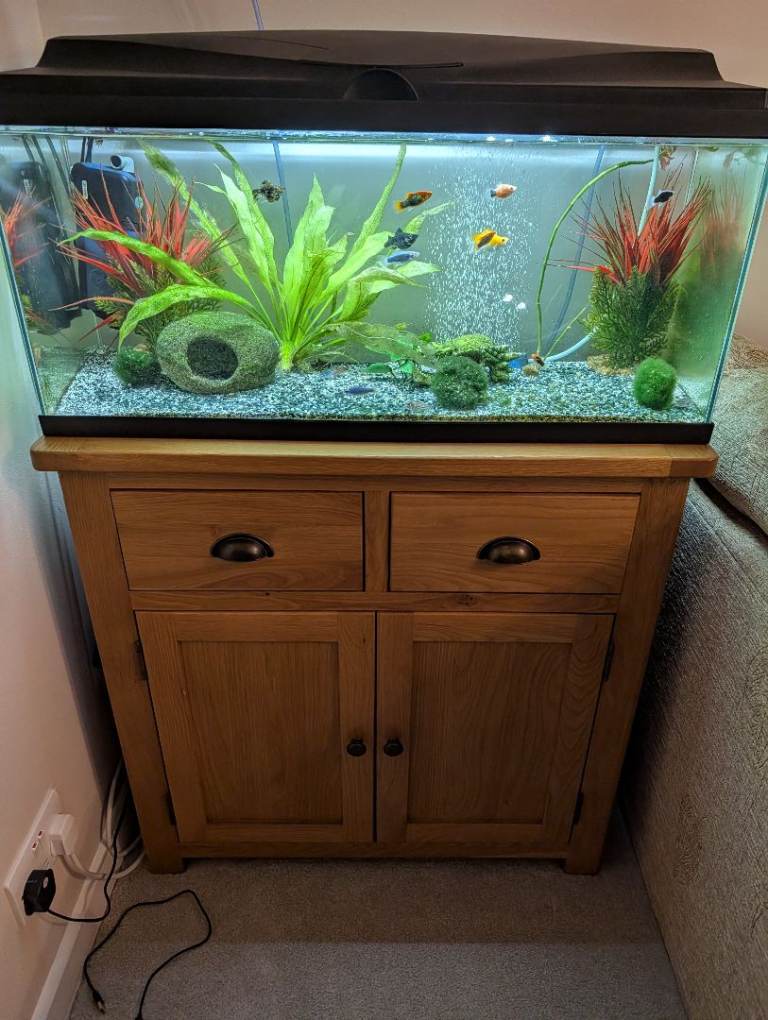 Posting for 8+ years100L Fish Tank with solid oak Cabinet, Filter, and Accessories