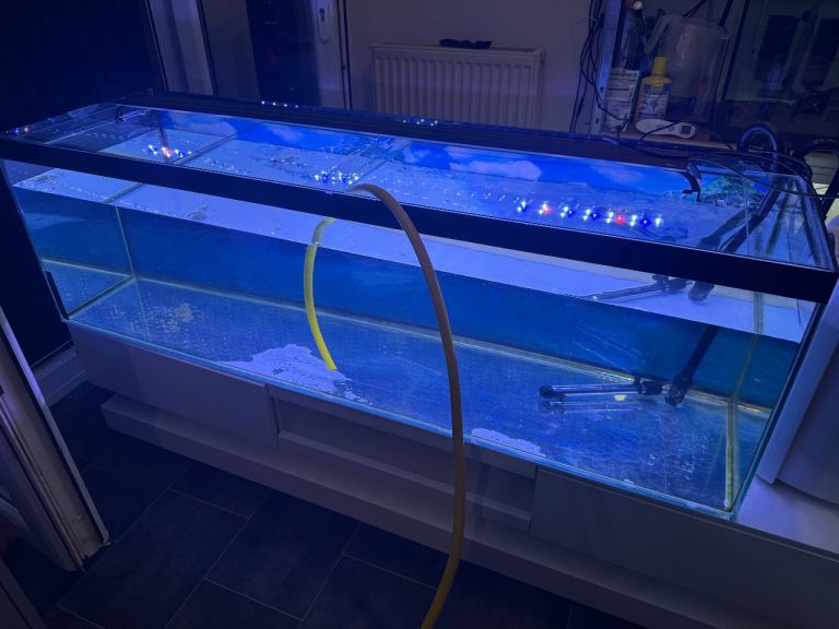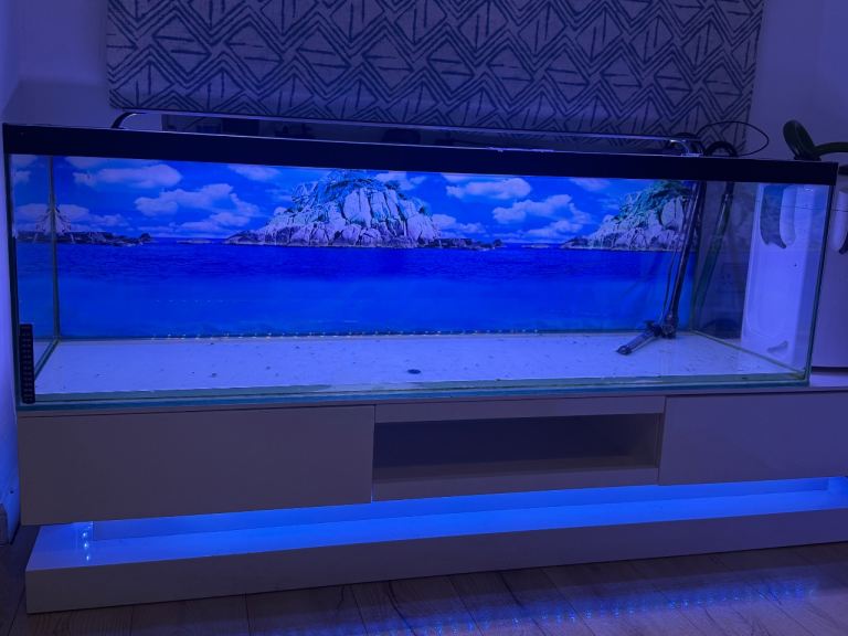 5ft fish tank comes with all pond canister filter and 4ft hyger led light all leds working as can been seen all seals are fine on the tank cracking big tank can come with or without the unit below unit had had a bit of 2x3 put along the back to support the full width of the tank any questions just ask will require a van for collection of can be delivered for fuel dependent on location currently cleaning tank out will fill with water to show is water tight so check back if photo not added yet will be shortly (now added) couple of bits of wood on slate added in also brand new in box 300w heater