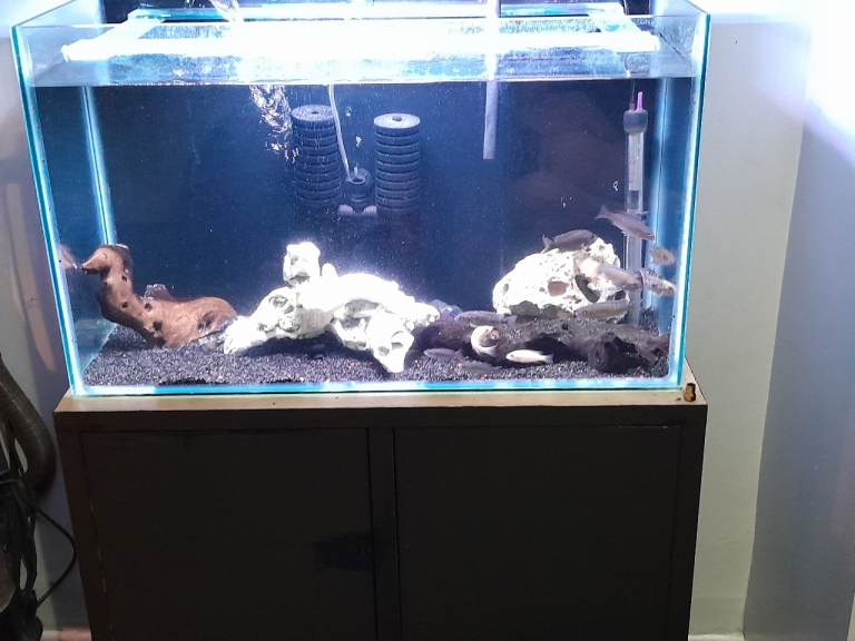 Here I have for sale is my 2 nd half foot Aqua fish tank (FULL SETUP) in good condition (very water tight) and looks great in any home, THE BACK OF TANK HAS BEEN PAINTED BLACK & STAND.... the set up comes with: