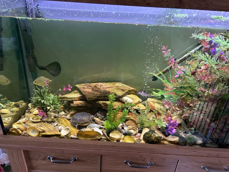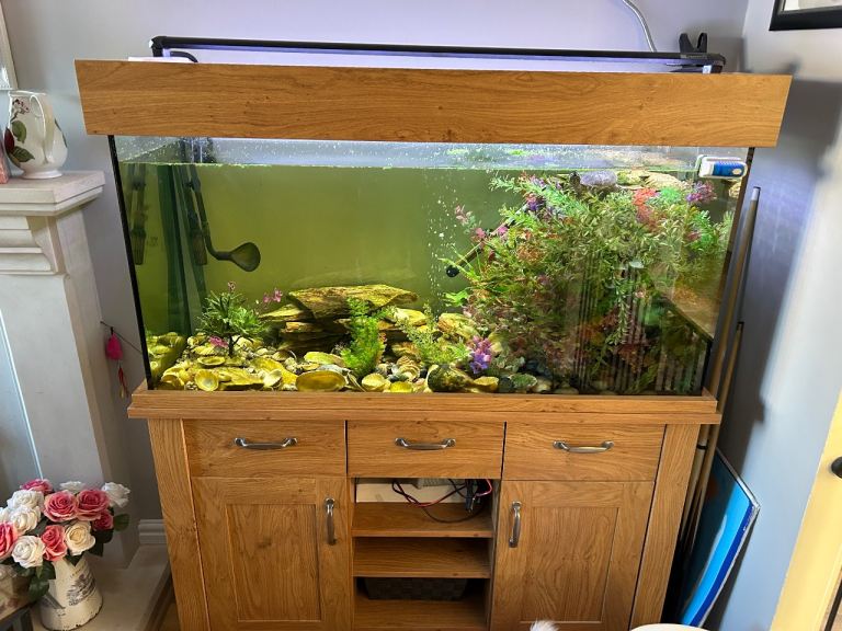 Fish tank for sale aqua one, 230 ltr, to include all contents including heater, lamp, light, plants, rocks and shells, filter pump and left over food and associated chemicals.