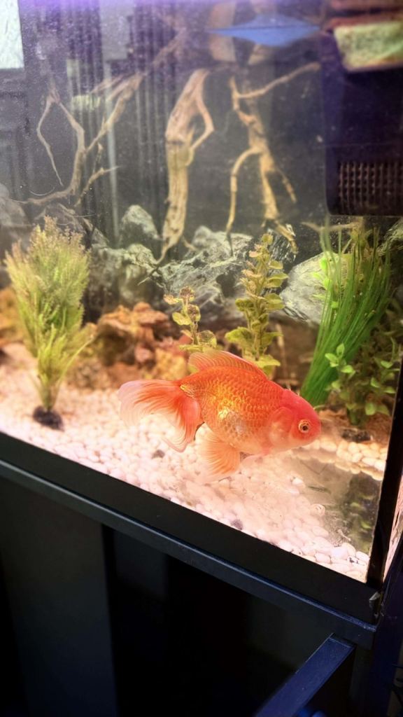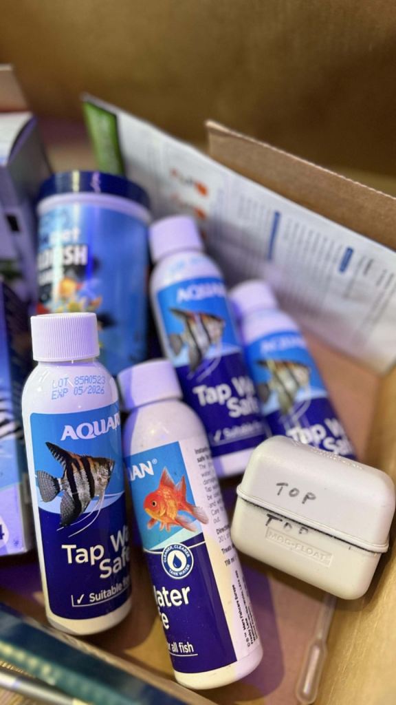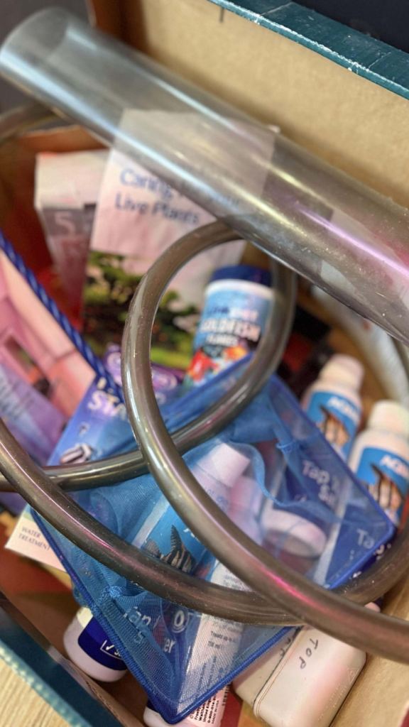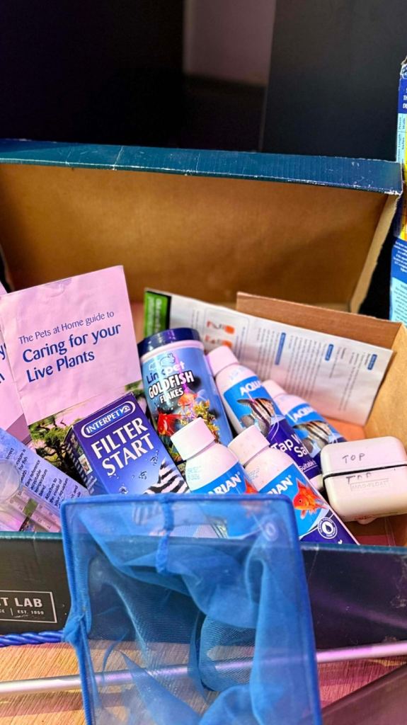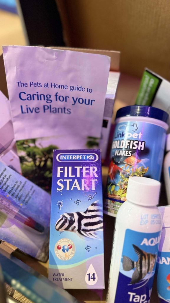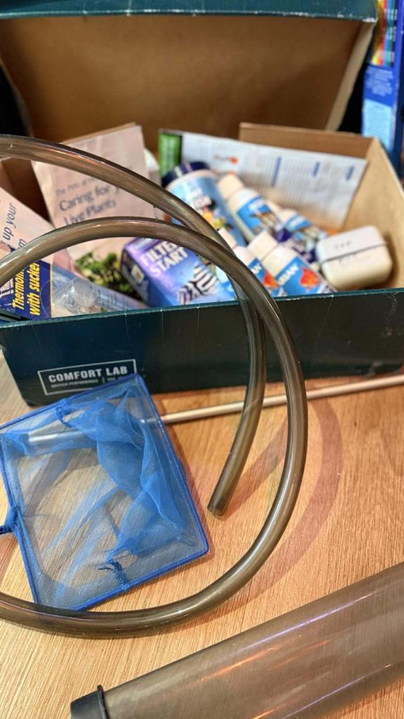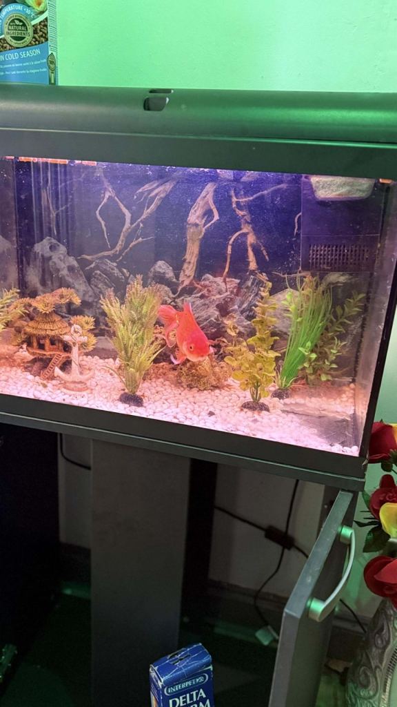 Fish tank 80 litres including the nice pretty golden fish with filter and white light and gravel and artificial folage/plants , net and pump and four bottles of tap water safe and fish food as well.