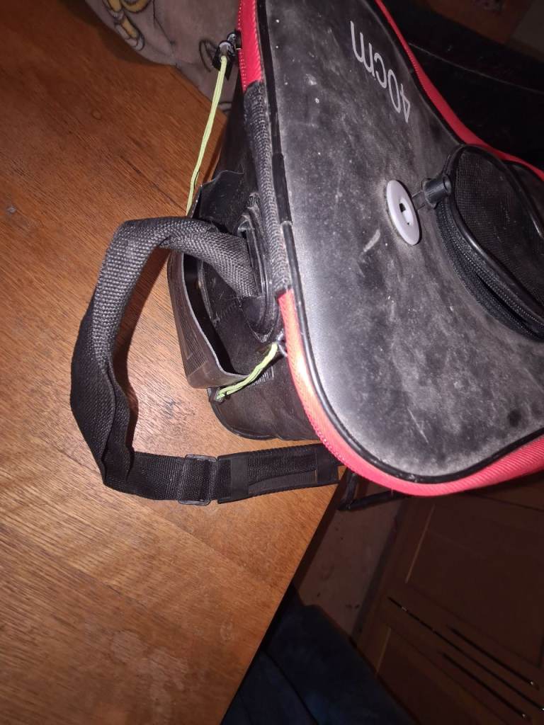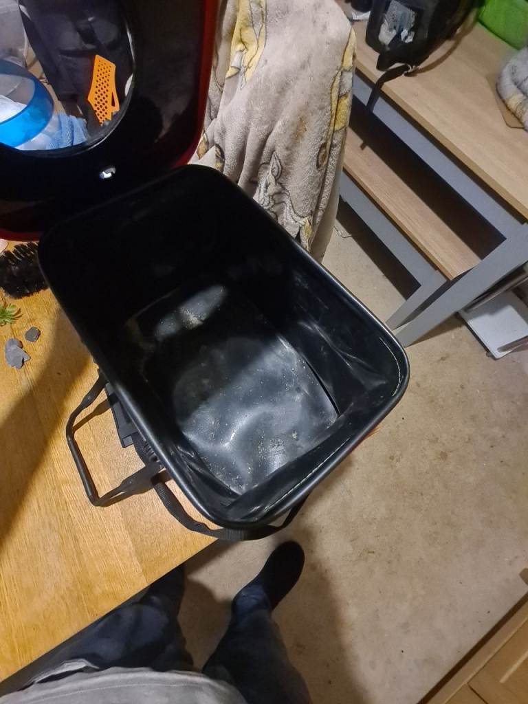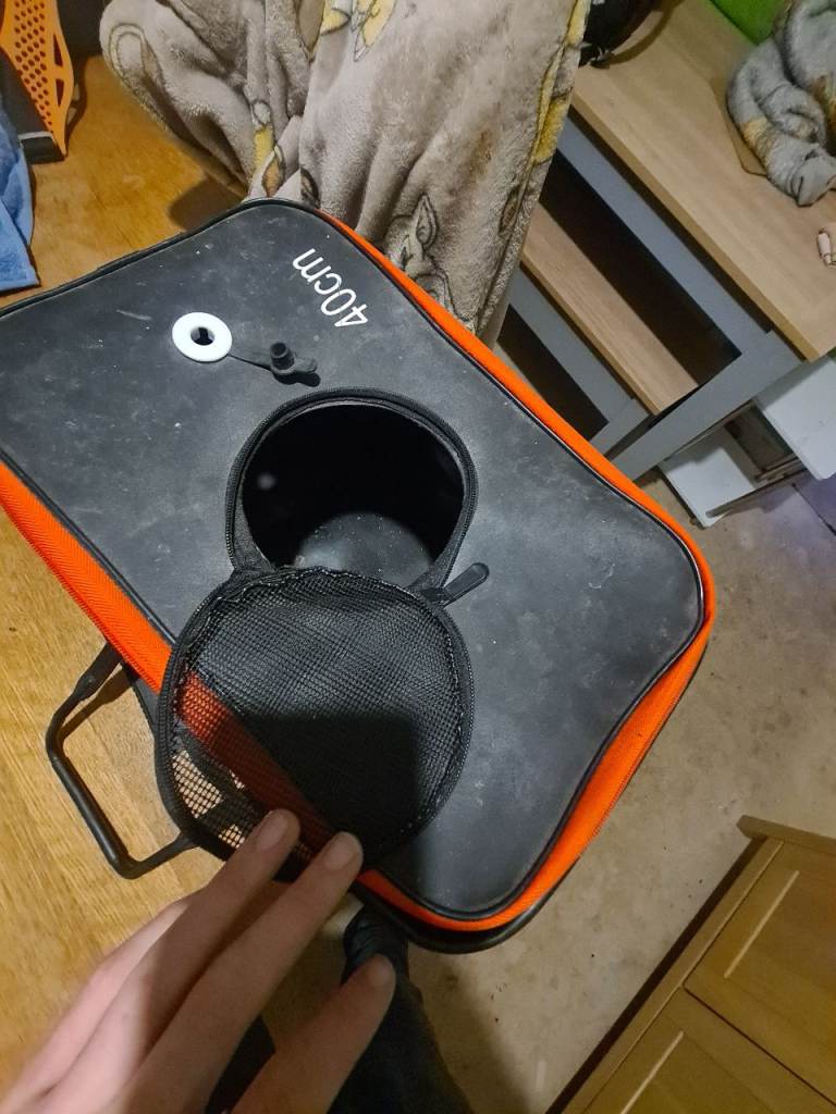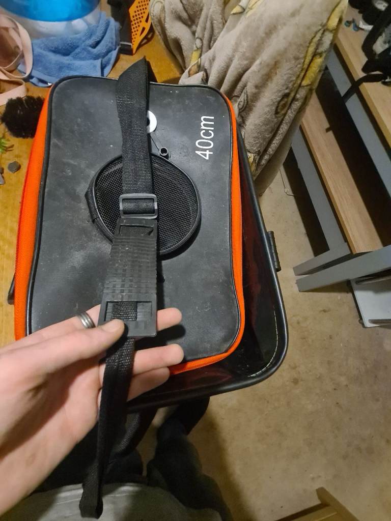 Has been cleaned its perfect for transporting fish and big fish it has a side pocket for a portable air pump has the hole for the pipe and buble stone also has a circlar zip on top for puting fish in or can open the full lid
