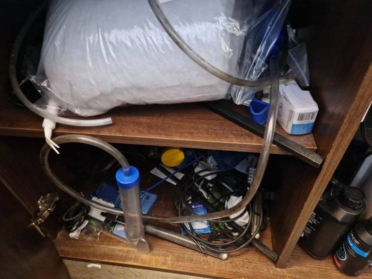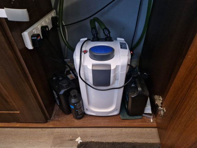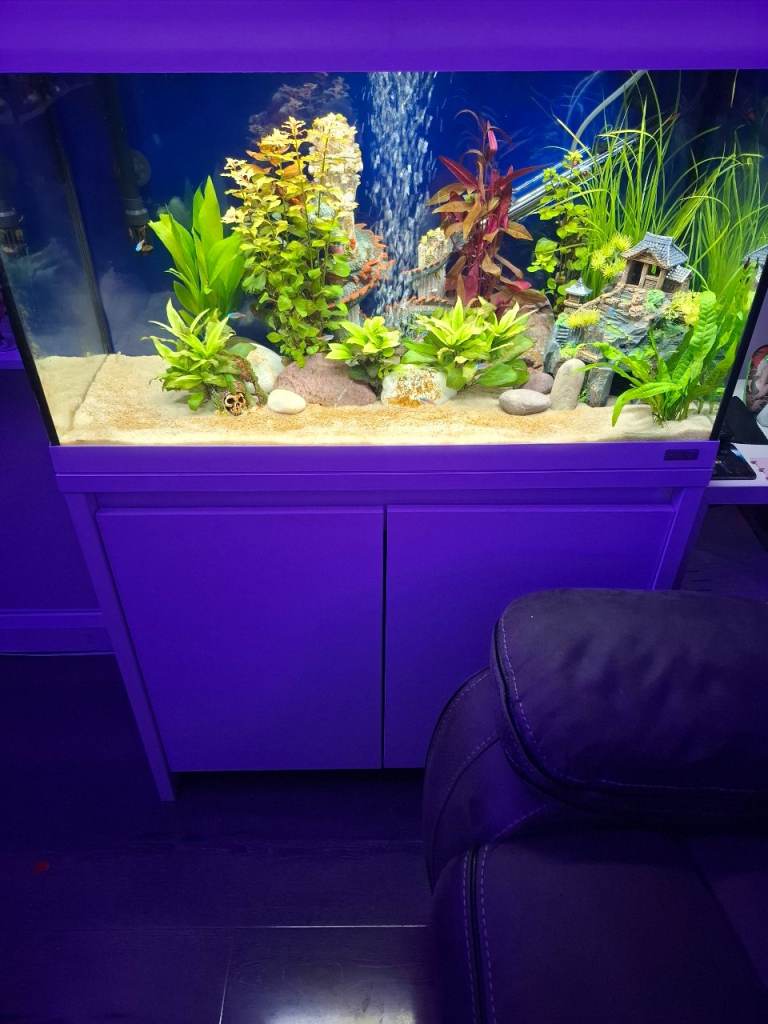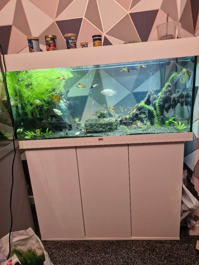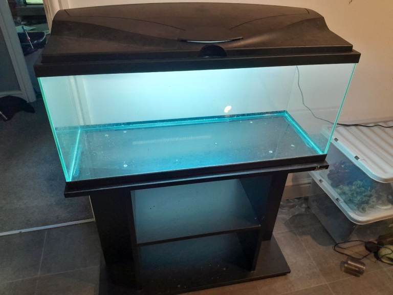 External filter 2 digital thermostat 3 heaters 2 lights 2 air pumps. Plants growths water changing mix test tubs comes with food and fish. Size 4ft long 18 inch wide 2ft deep.