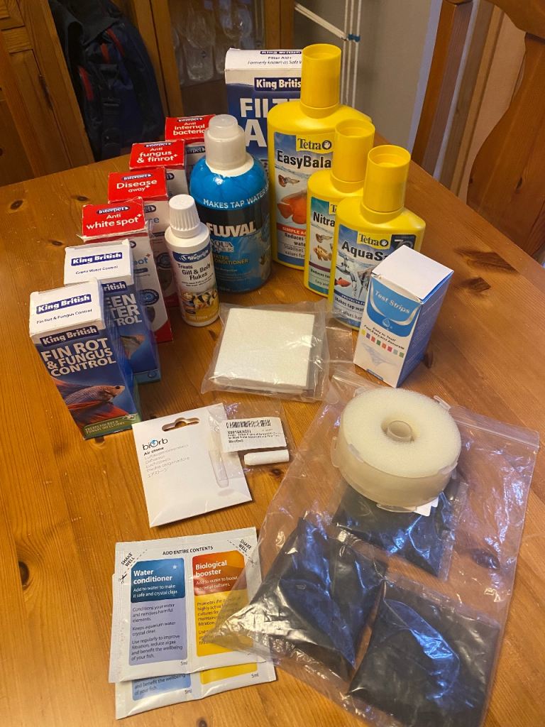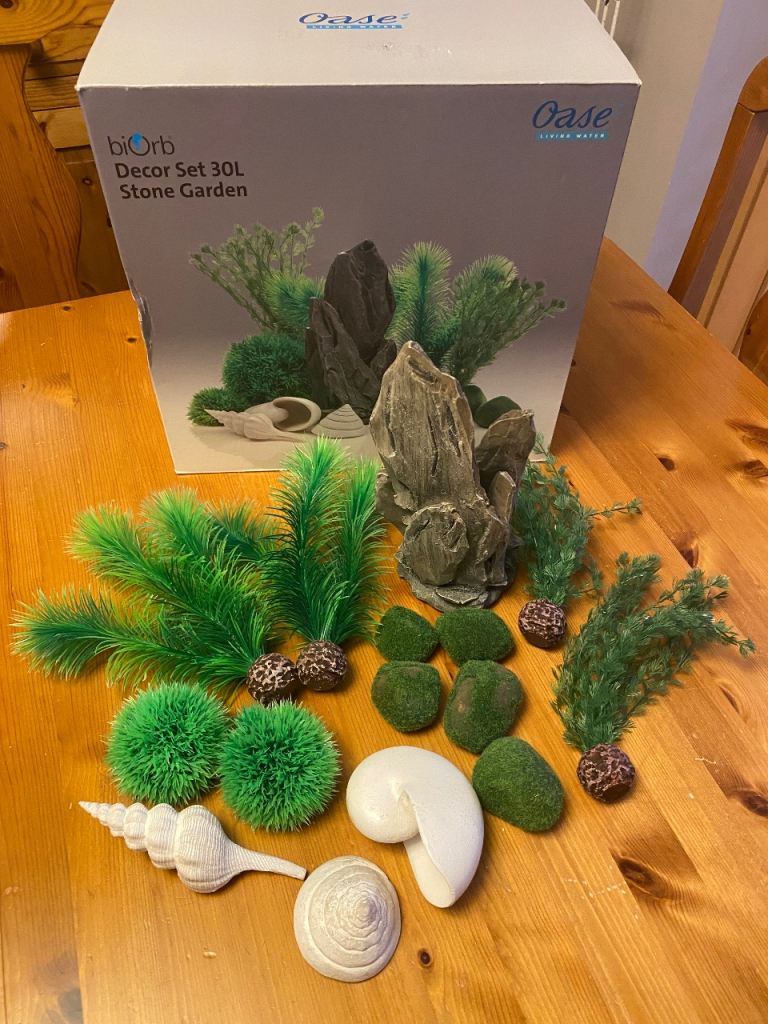 Full set up (in original box) with 2 ornamental decor sets (castle & slate). Includes water pump & heater, cleaning equipment (including 2 20l buckets), part used water chemicals, water test strips, fish food & fish treatments. In full working order and in good condition. Cost of everything new would be over £300, looking for £70 (which is the cost of new Slate decor set on its own).