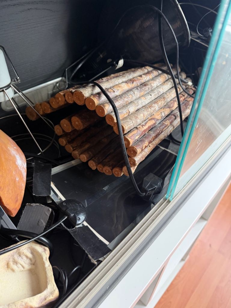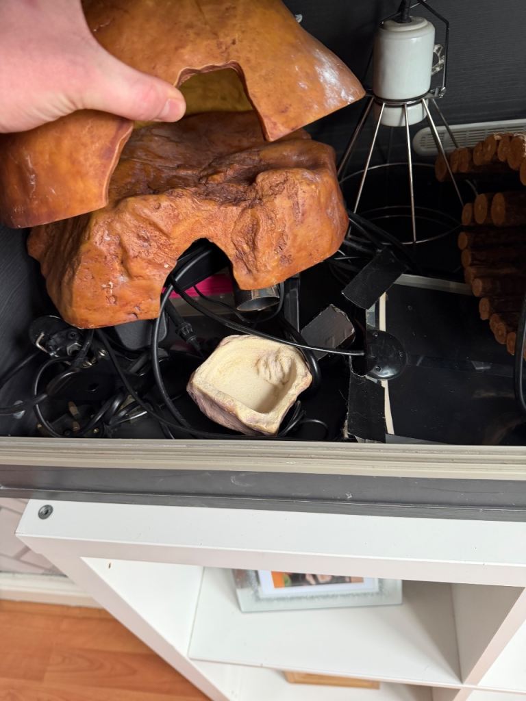 Includes a few different sized heat mats, feeding bowl, a hide, and a decorative log tunnel.