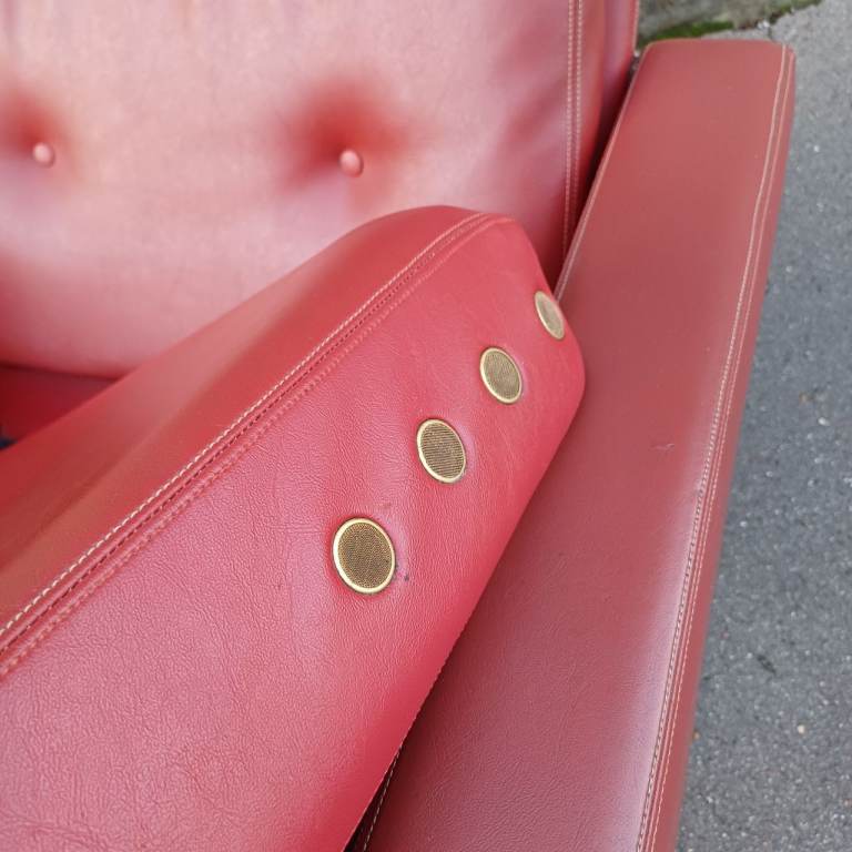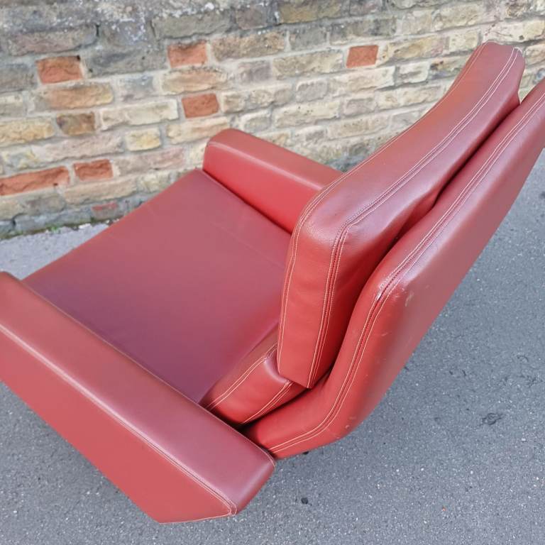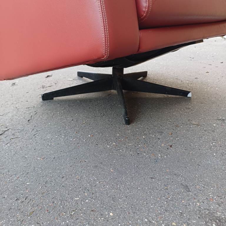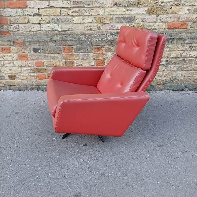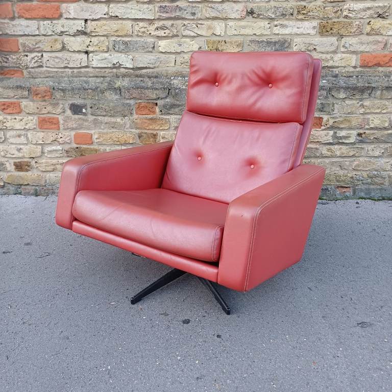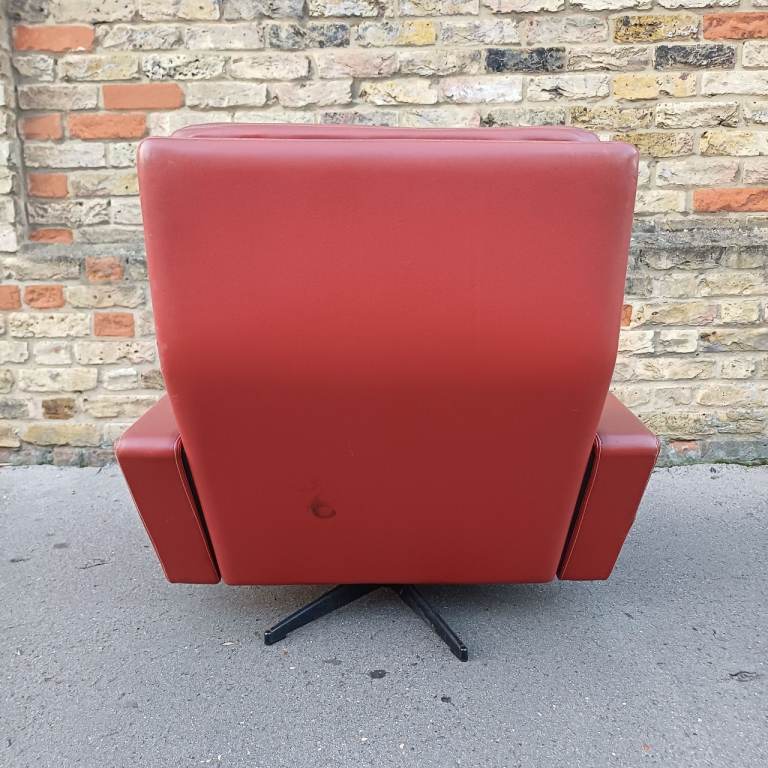 A rare vintage armchair with foot stool ,designed in the 1960's .in decent condition very comfortable ,minor surface wear ,It is well padded, structurally sound and swivels .