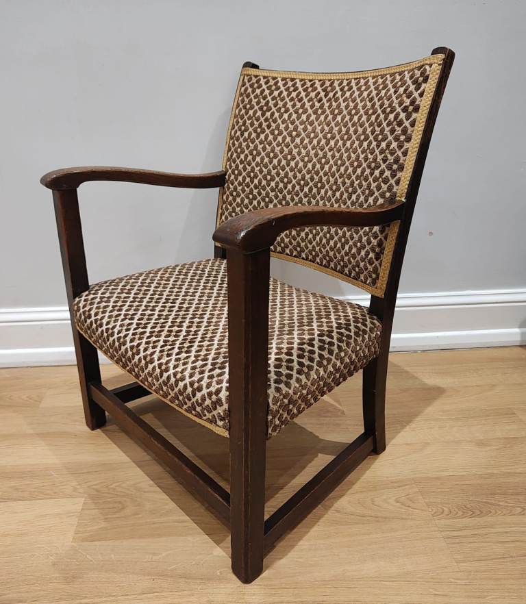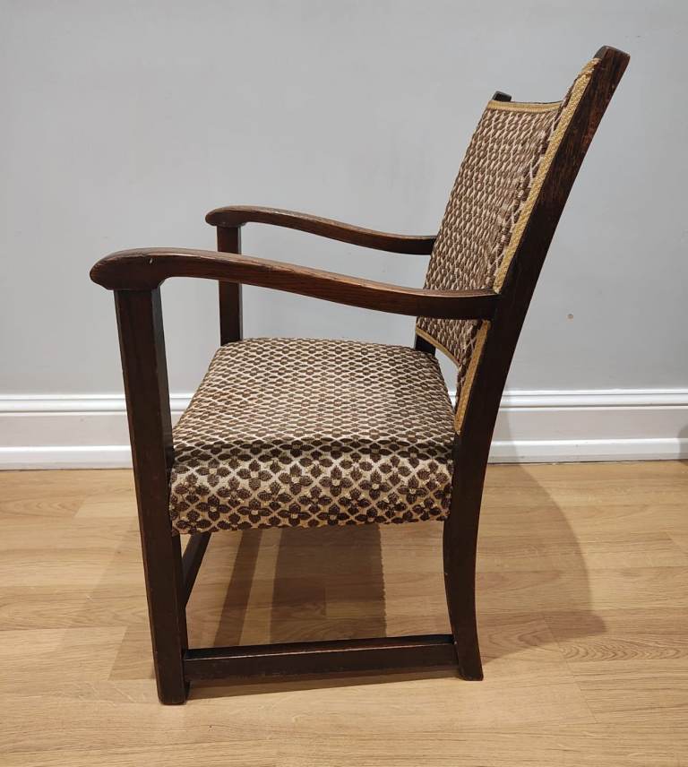 Antique armchair. Solid and sturdy oak frame, covered with embroidery fabric, geometric pattern, brown and gold in colour. Wood grain showing through polished wooden design.