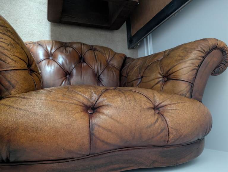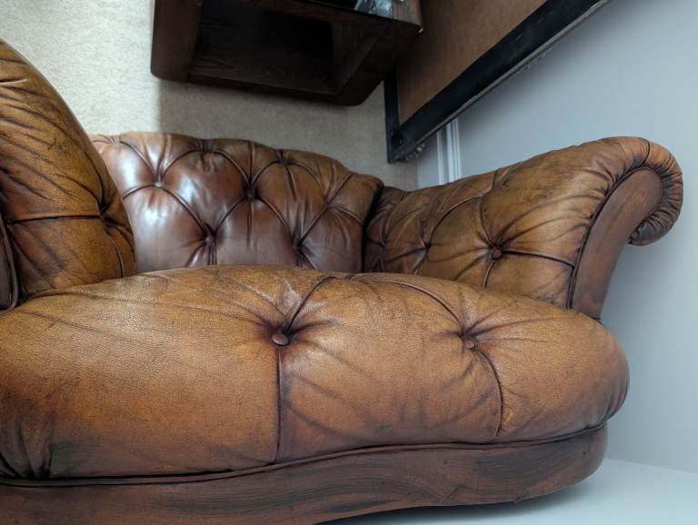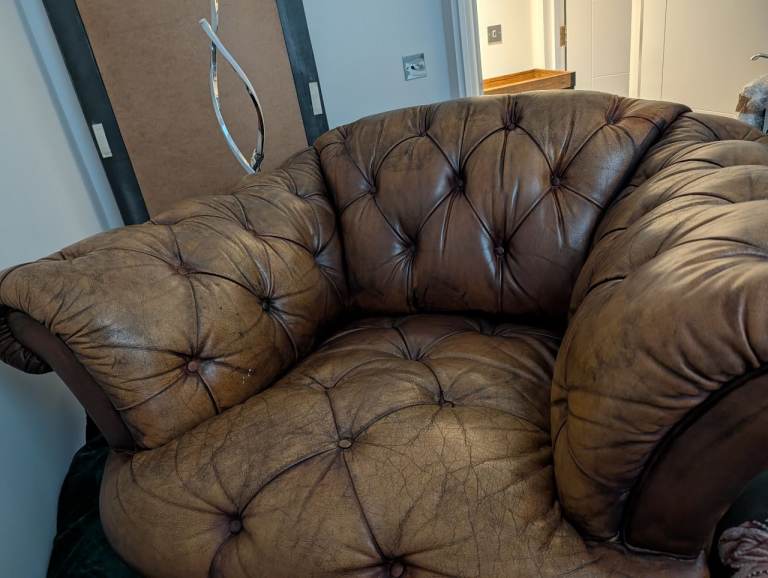 Chesterfield armchair with foot stool in storage ATM so not Very good pictures