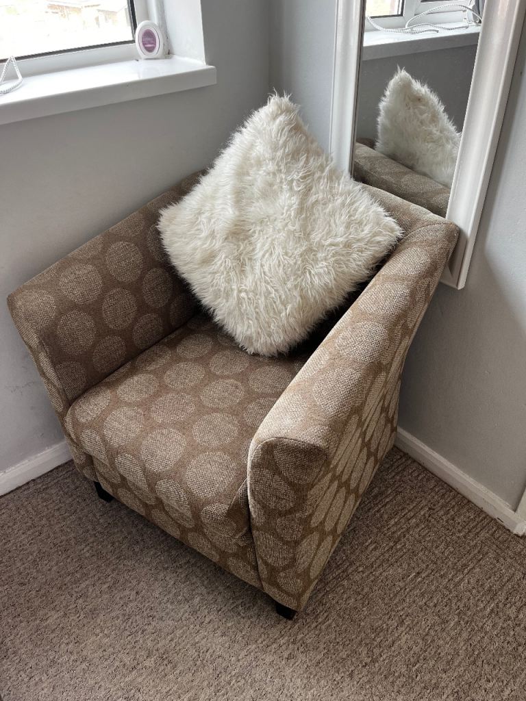Comfortable armchair in good condition, perfect for a bedroom, living room, or reading corner.