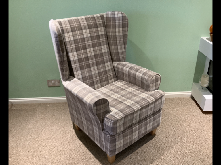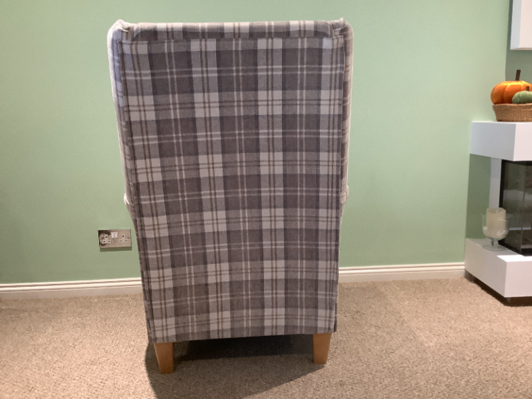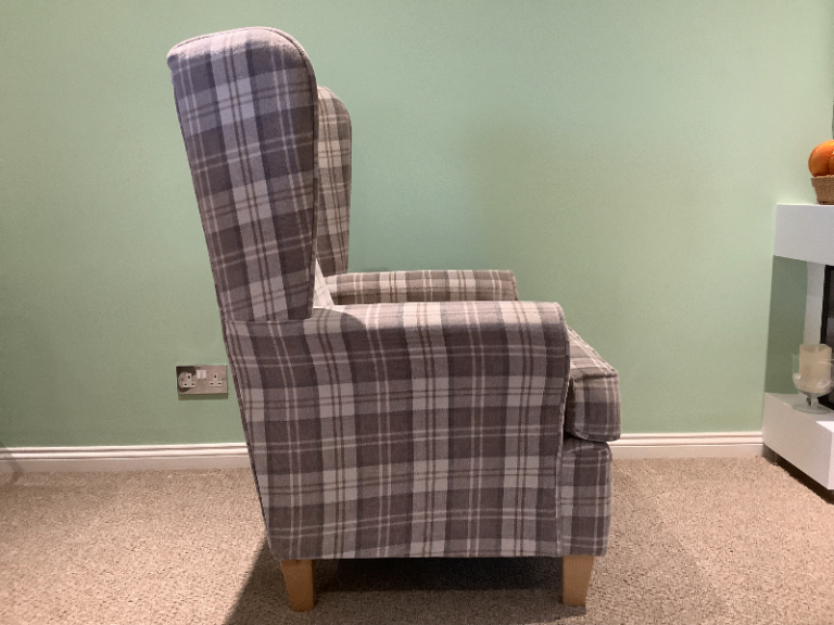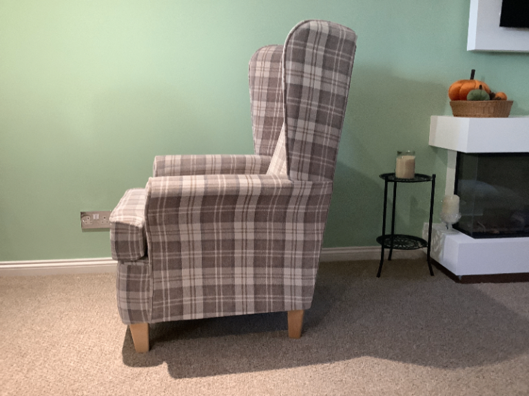 A check or tartan type fabric cosy wingback armchair. It is in very good condition, no stains or marks. Seat padding is supportive and comfortable. The colour is a mix of cream and light browns. The seat cushion is reversible.