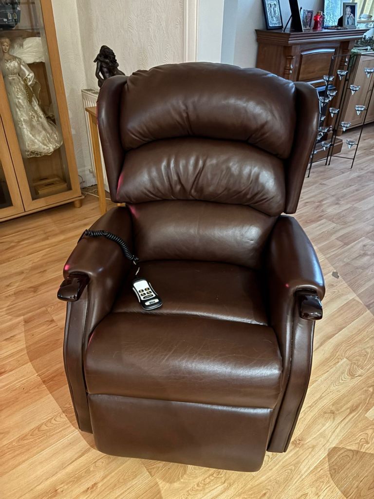 Easy armchair for sale. Very comfy. Suede feel.Includes cushion. Terracotta colour. Dark wooden feet. Height 90 cm x Depth 76 cm x Width 90 cm approx. Good condition. Now gone to a good home!