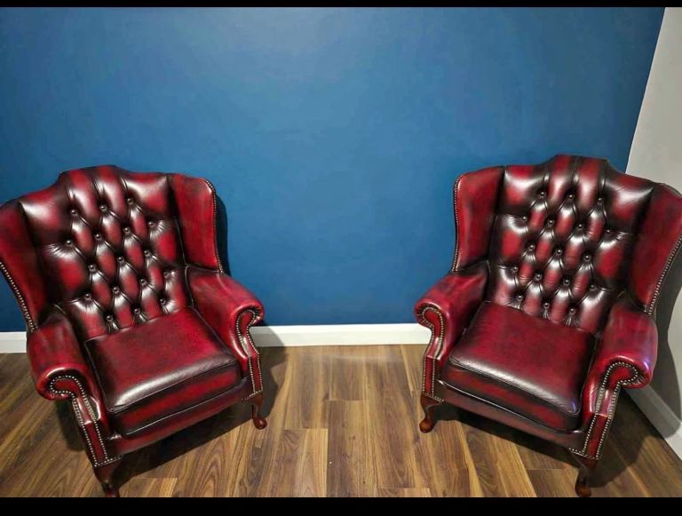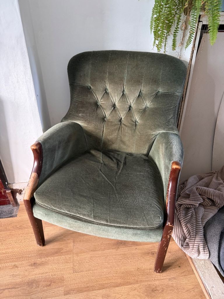 This piece is a lovely example of a leather Chesterfield Queen Anne Armchair. The frame is very well made and solid. This chair has had some refurb on the arms as well as on the lining under the cushion. Otherwise the leather is in healthy condition with no tears, stains or holes. The colorway is a beautiful dark, deep green /black tone.