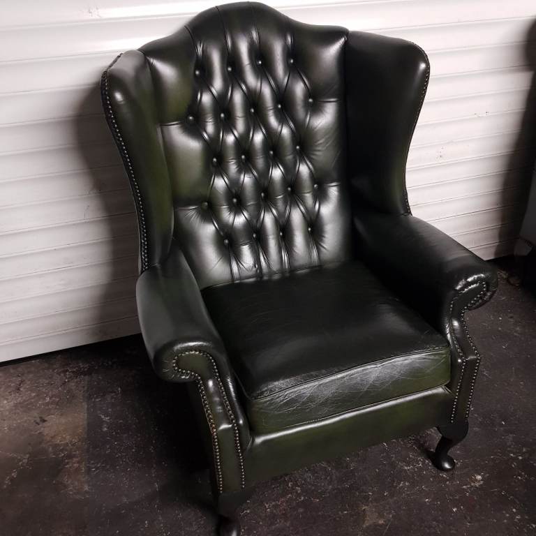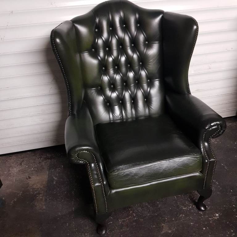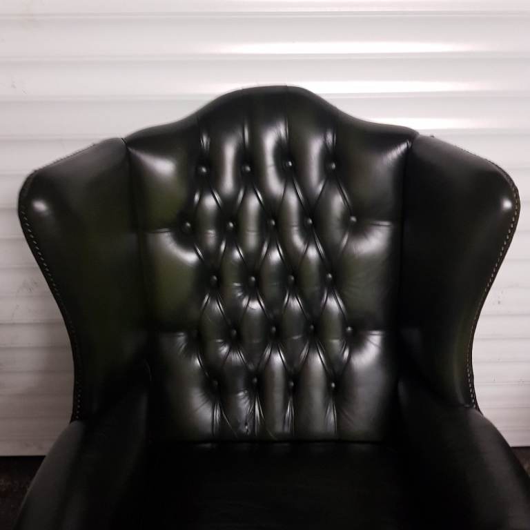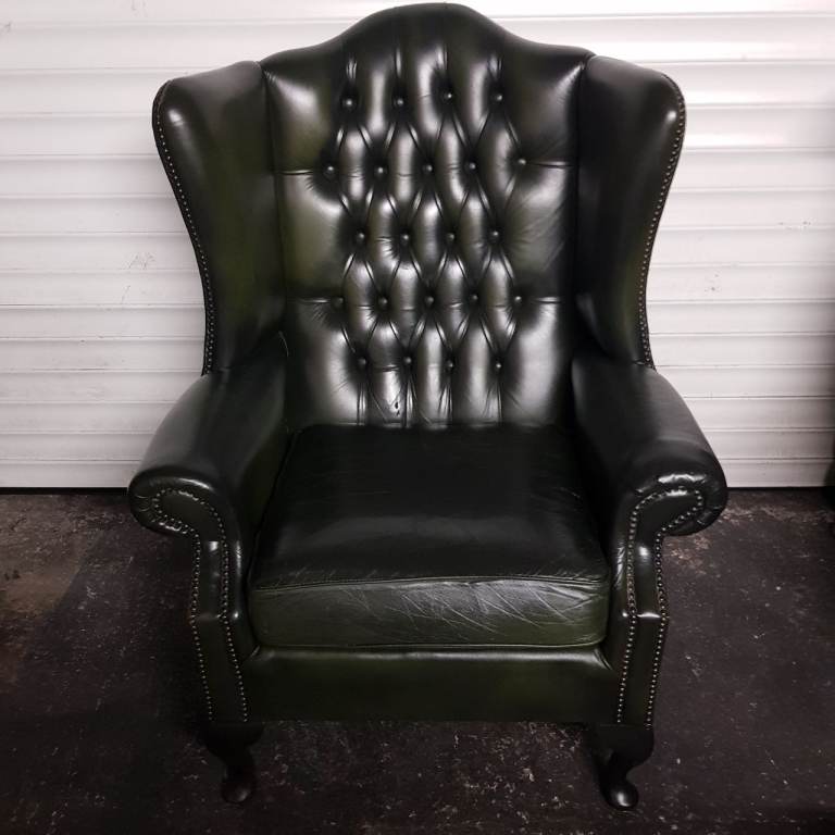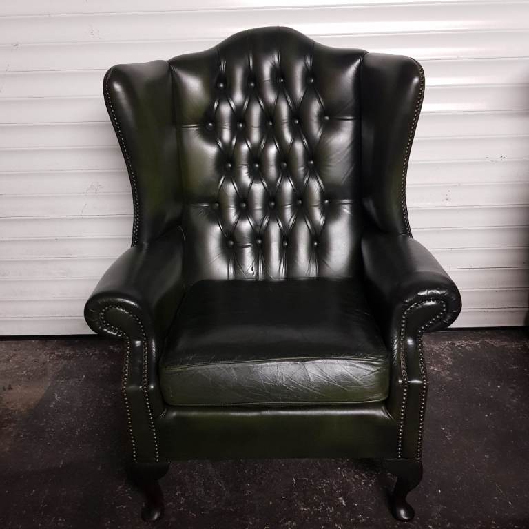 Beautiful Dark Green Leather Chesterfield Winged arm chair QUEEN ANNE - Stud Det