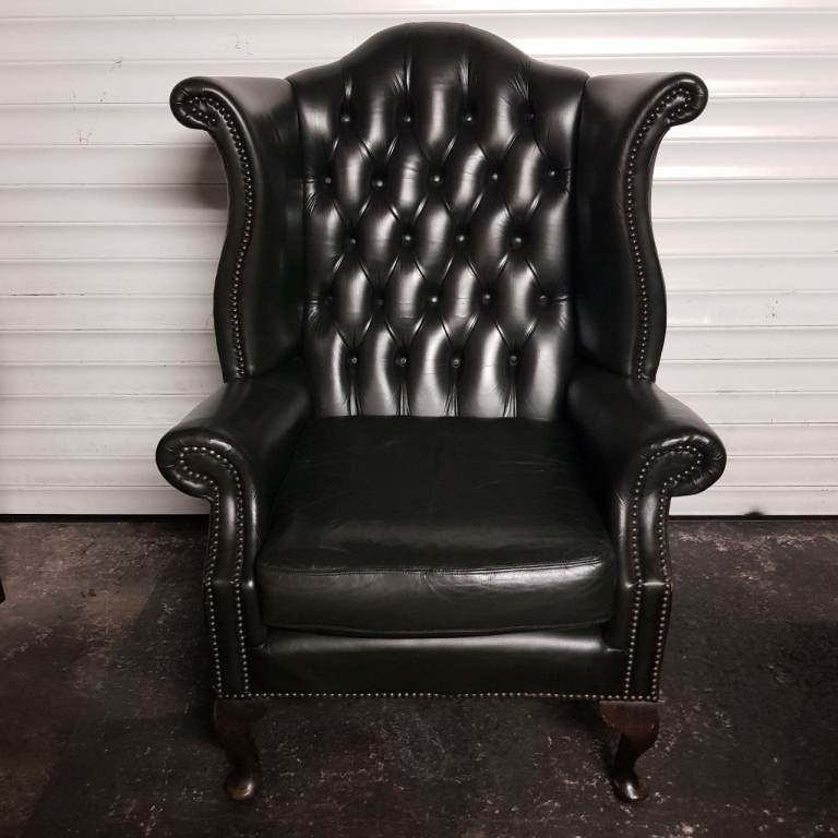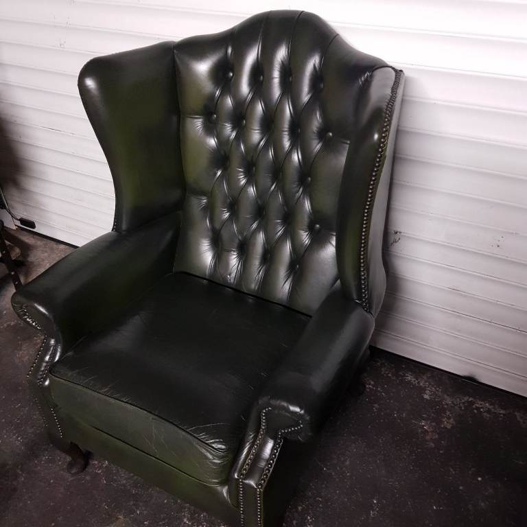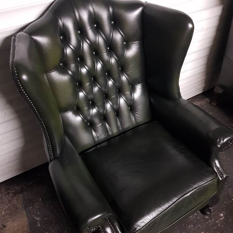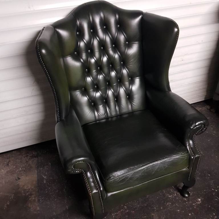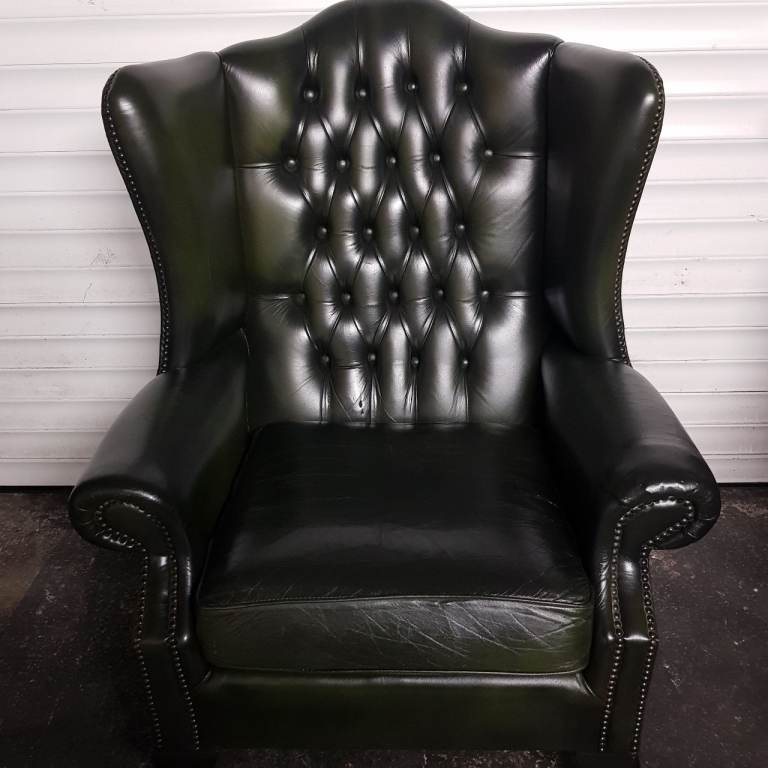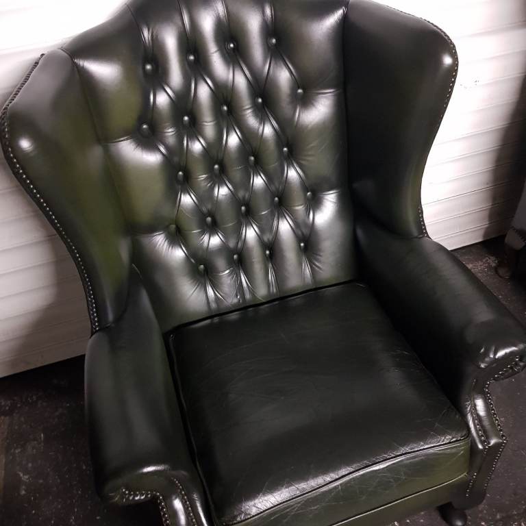 Beautiful Dark Green Leather Chesterfield Winged arm chair QUEEN ANNE - Stud Det