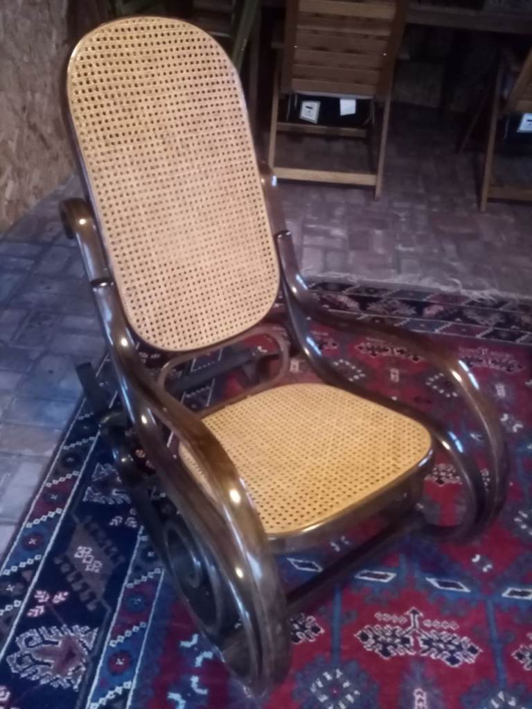 Wooden rocking chair. It has been in the family since it was bought new, but time to move to another home. This is a vintage rocking chair purchased in Greece in the 1980s. In good condition with some signs of wear as expected given the age. The cane weave is in perfect condition and strong.