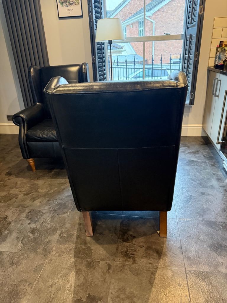 Black real leather high back arm chairs.