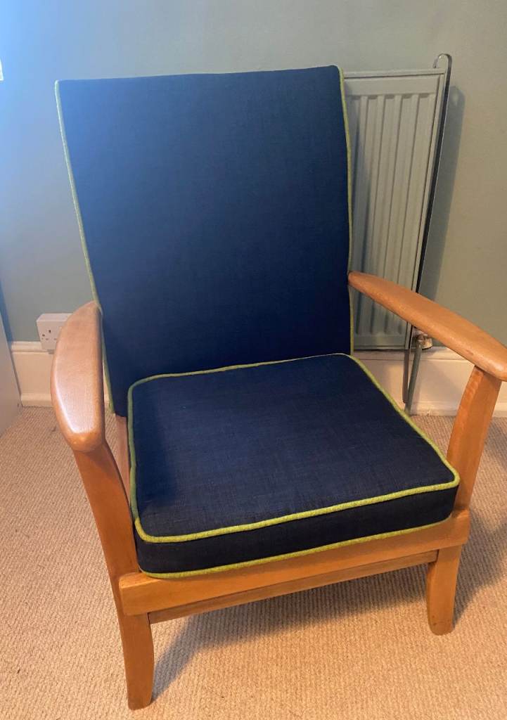 Stylish contemporary armchair, light wooden frame, navy blue with a striking lime green piping. 86cm tall, 63cm wide, 54cm deep, height seat is 38cm.