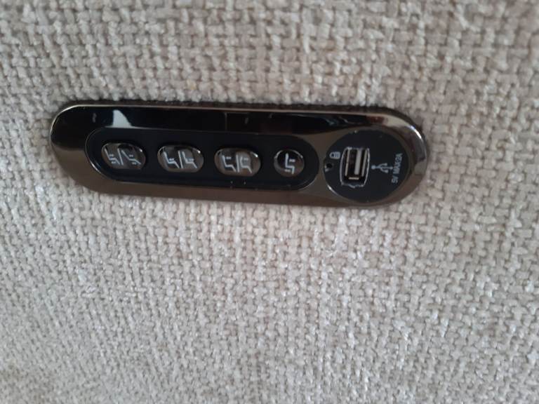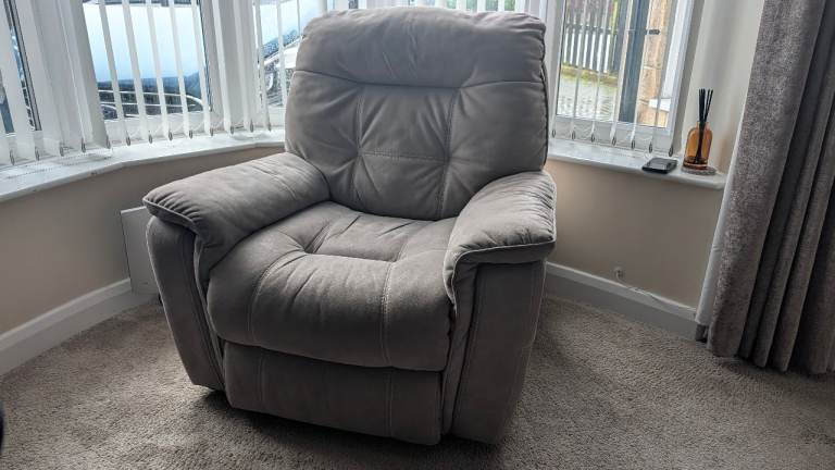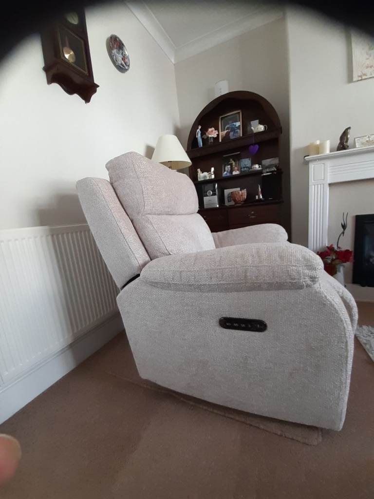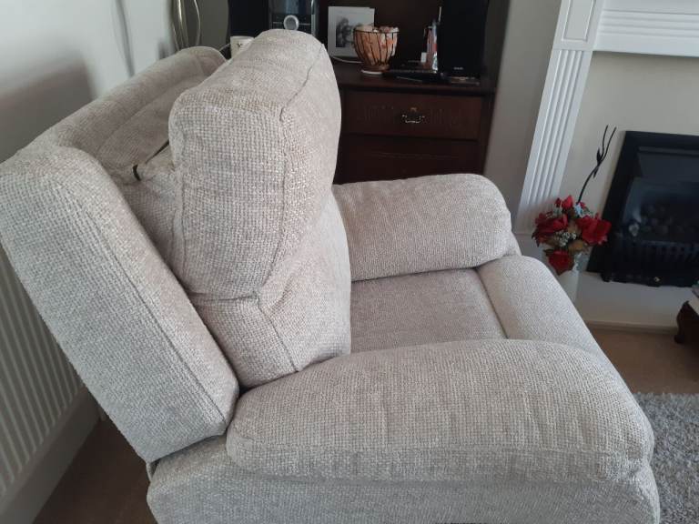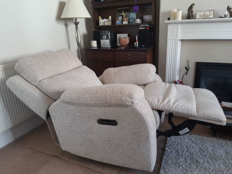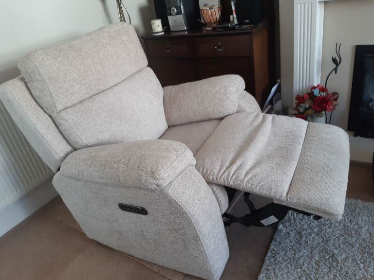 Beautiful neutral coloured textured fabric recliner with independent head and lumbar adjustments. Only one year old, cost appx £1100 but space needed now. USB port and long power cable. 38in wide, appx 38in deep and 38in high. Seat depth appx 22in.
