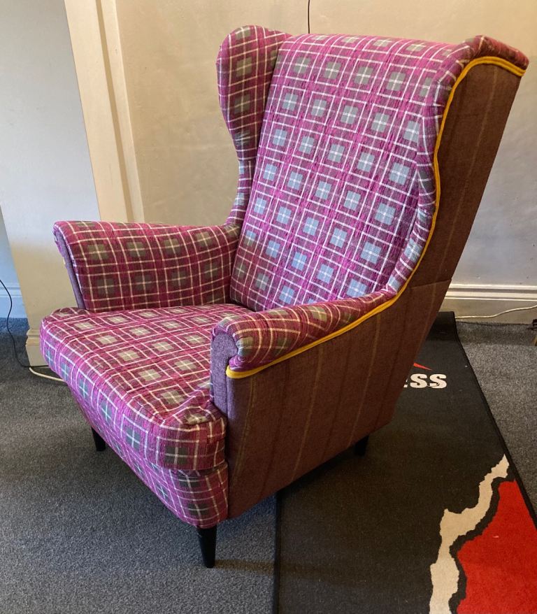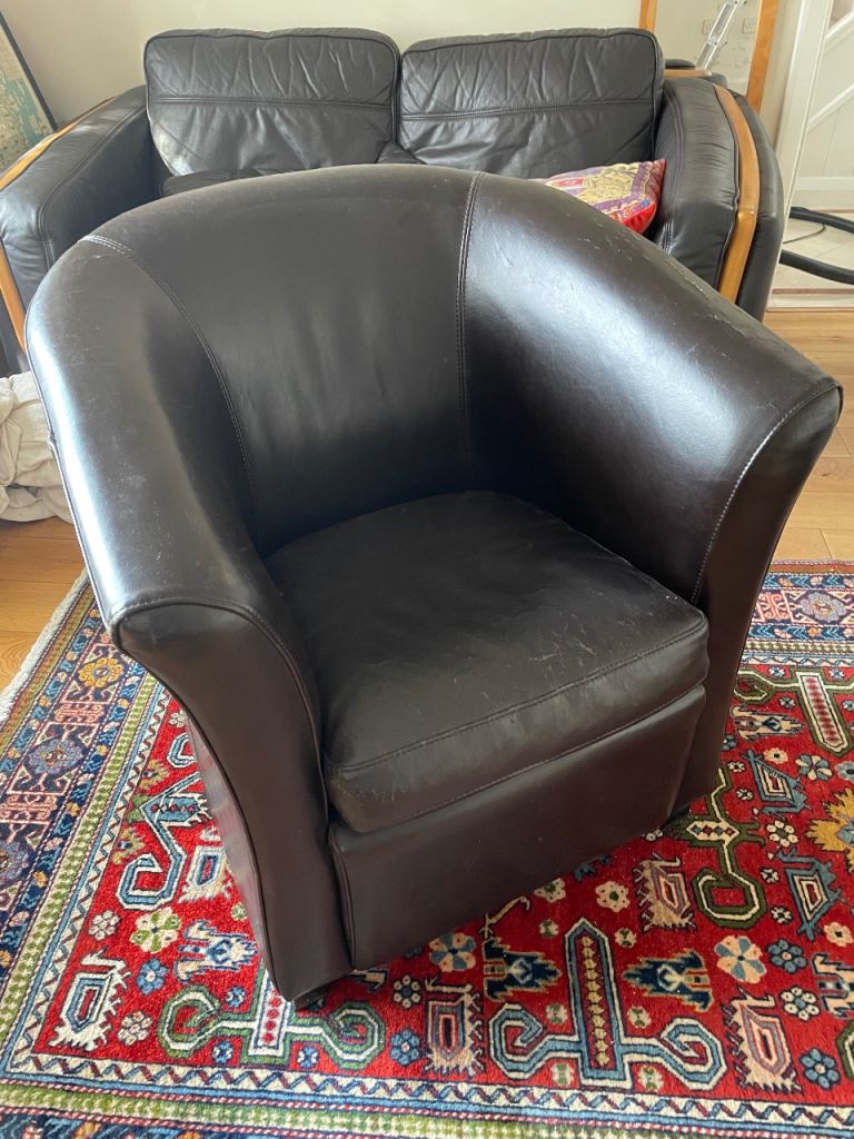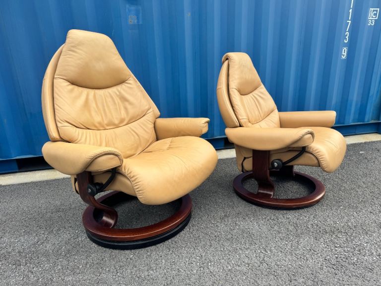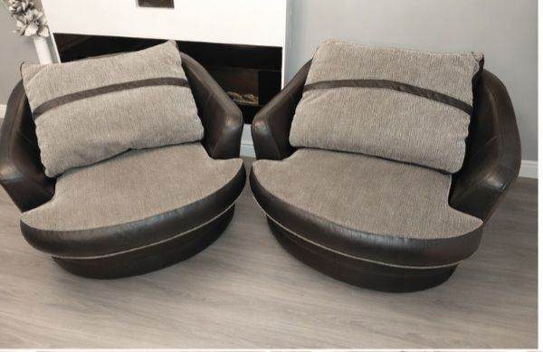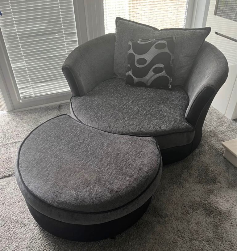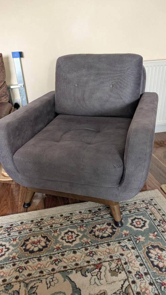 Beautiful neutral coloured textured fabric recliner with independent head and lumbar adjustments. Only one year old, cost appx £1100 but space needed now. USB port and long power cable. 38in wide, appx 38in deep and 38in high. Seat depth appx 22in.