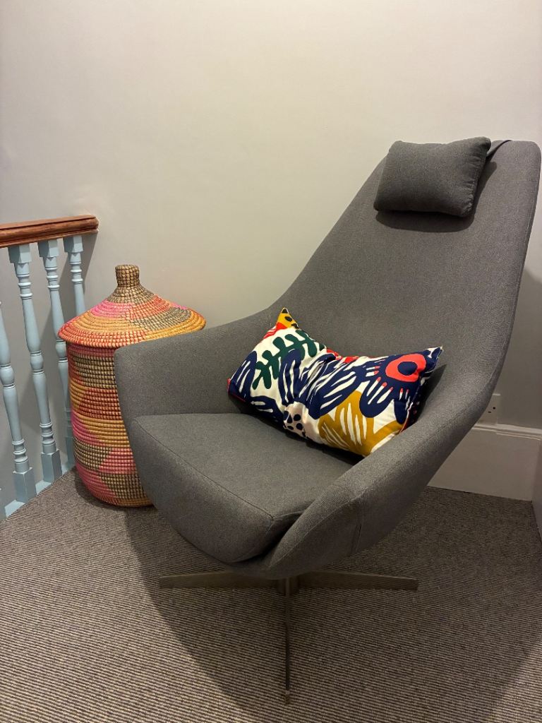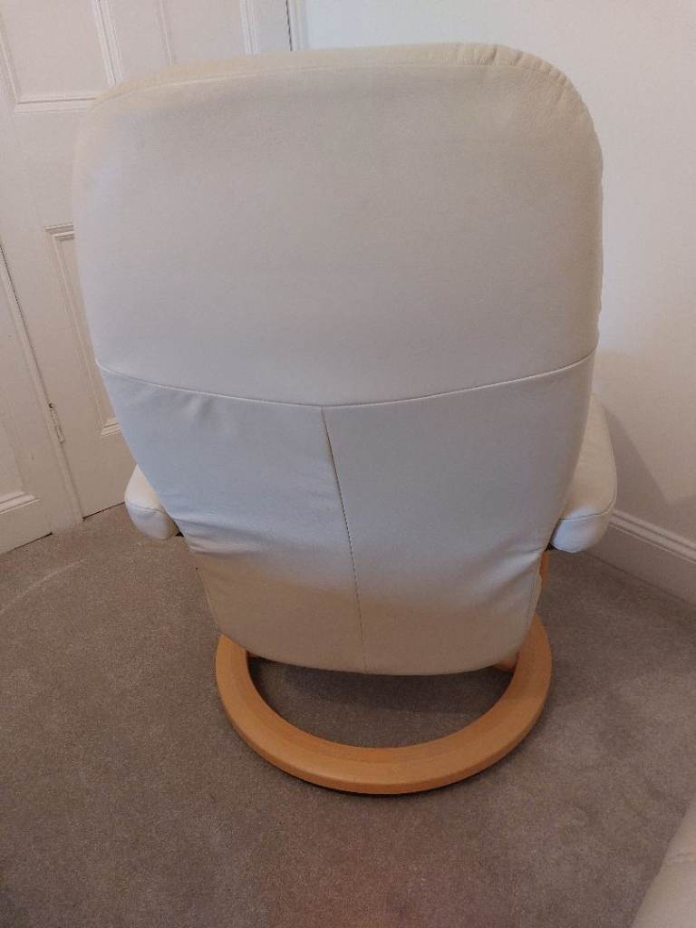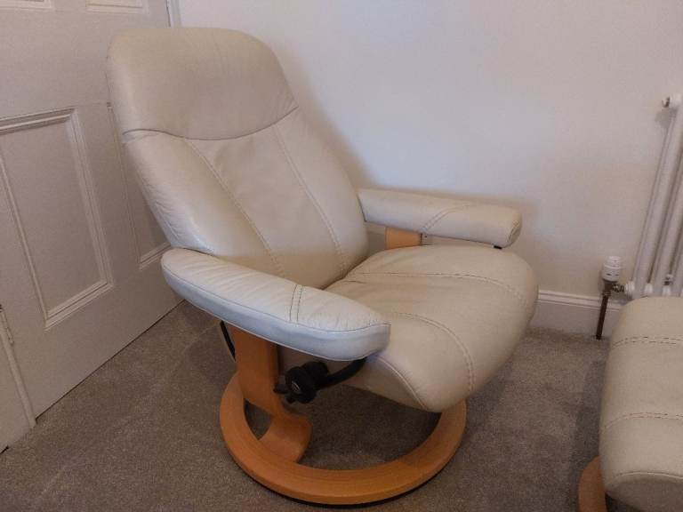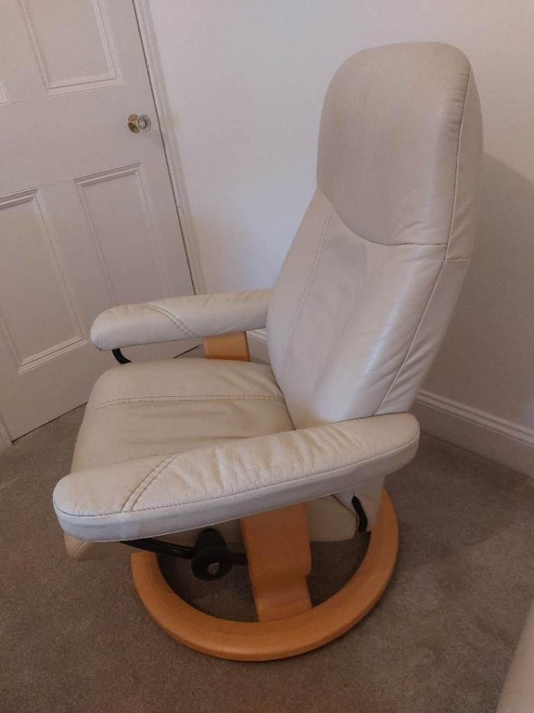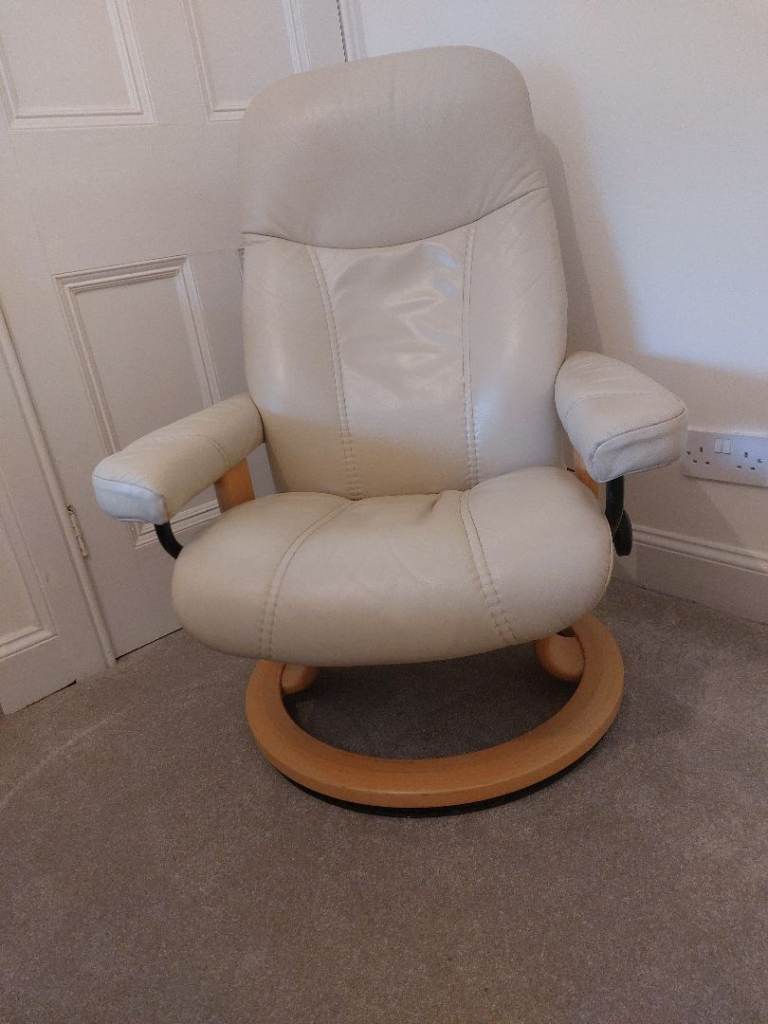 The Ekornes Stressless Cream Consul Recliner Chair and Footstool is a luxurious and comfortable piece of furniture, and sized 'small', will fit neatly in any room of your home. Current owner is 5ft 7" and finds it a perfect fit for her!