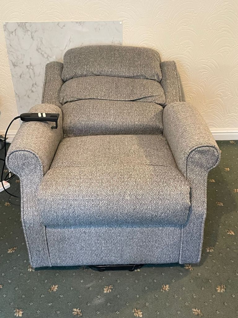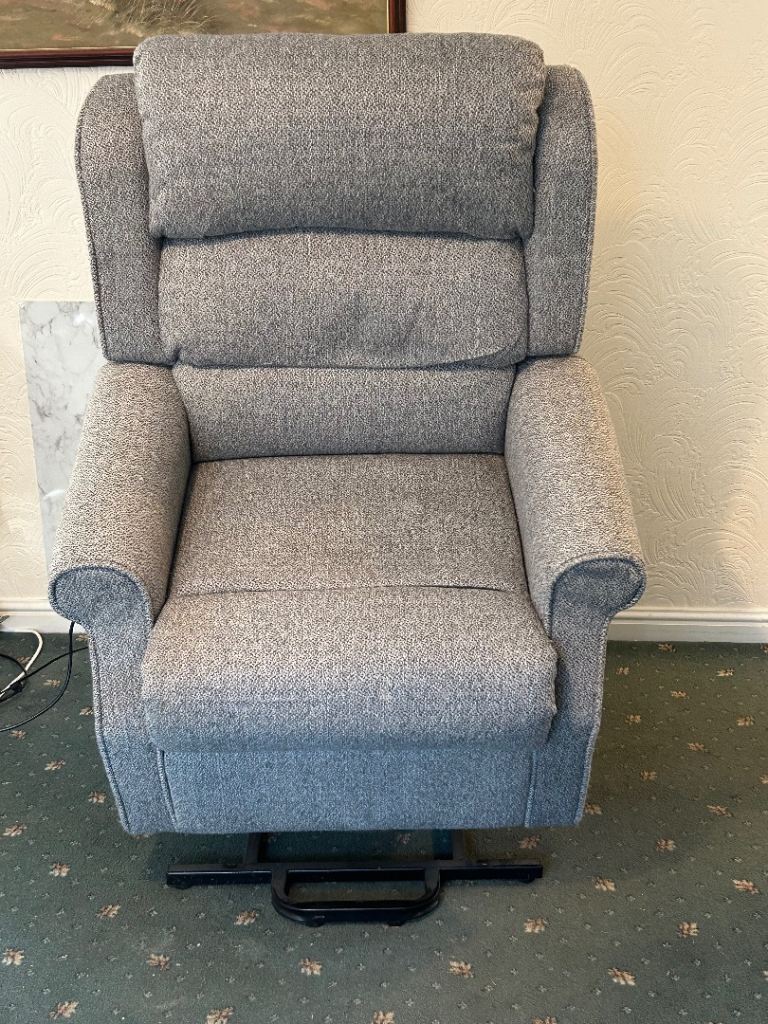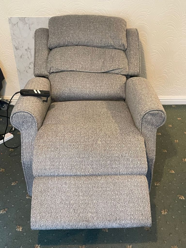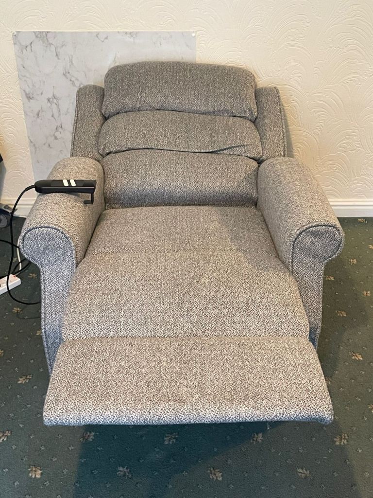 Lovely electric rise and recline armchair. Back of armchair and foot rest can be adjusted together or independent of each other. Chair rises to help you to stand. Chair reclines to almost completely flat.