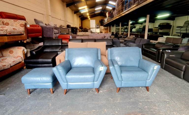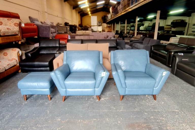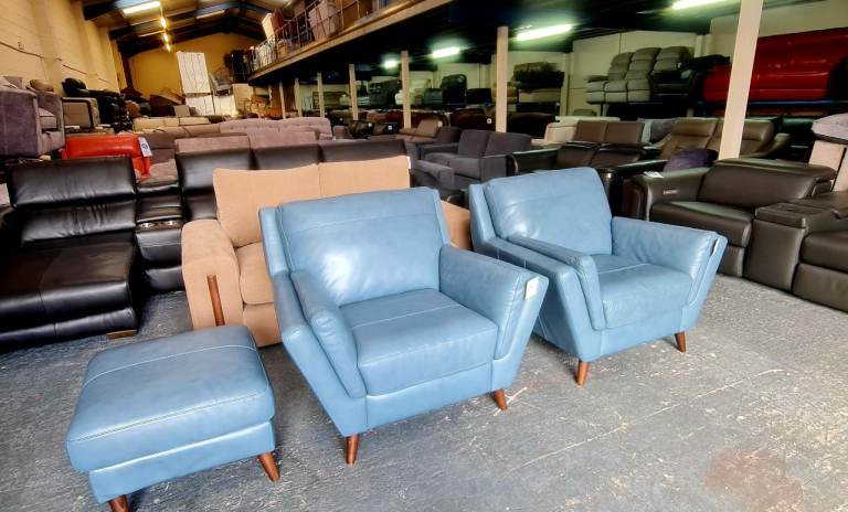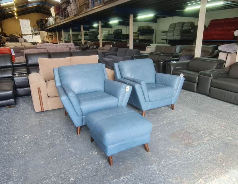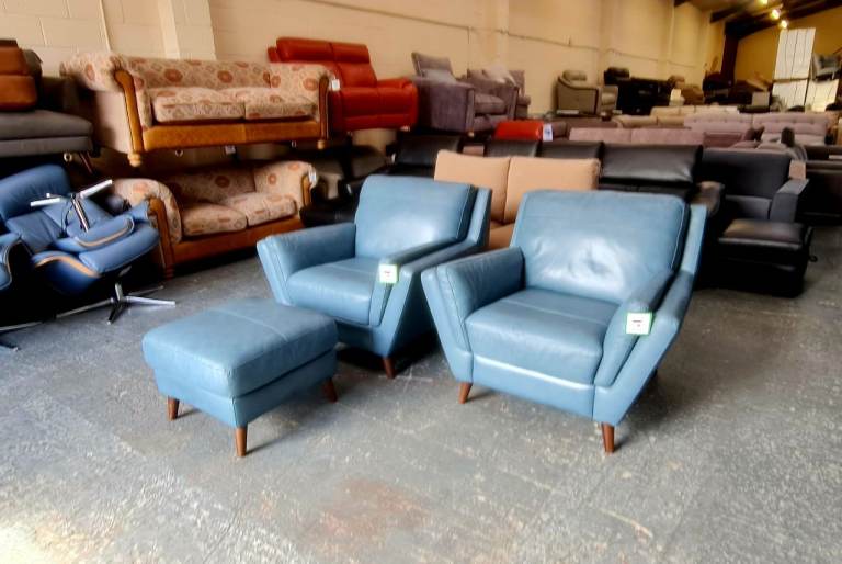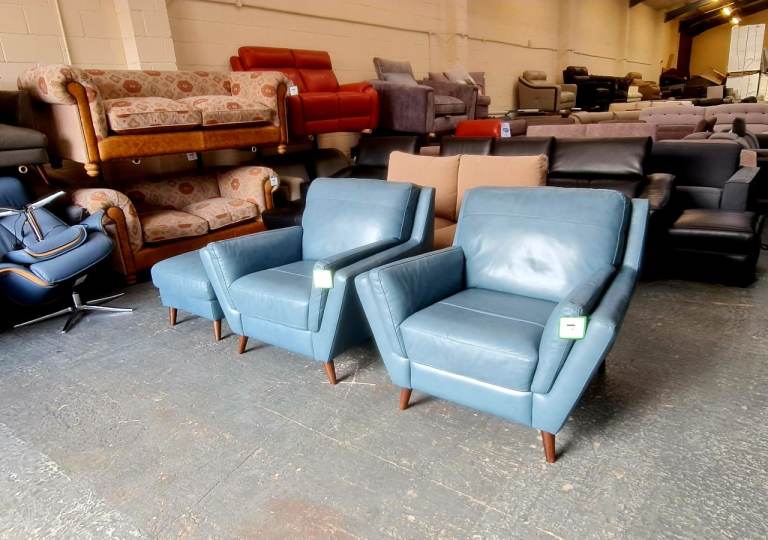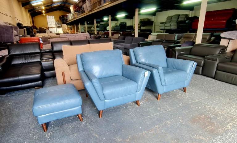 Ex-display Fellini Alaska Steel Blue leather armchairs x 2 and footstool in excellent condition.