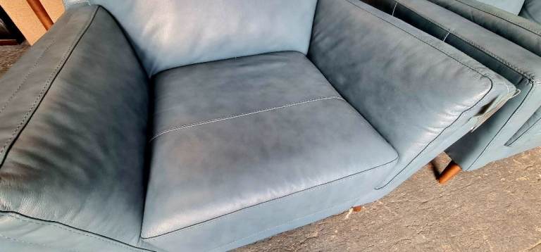 Posting for 8+ yearsEx-display Fellini Alaska Steel Blue leather armchairs x 2 and footstool