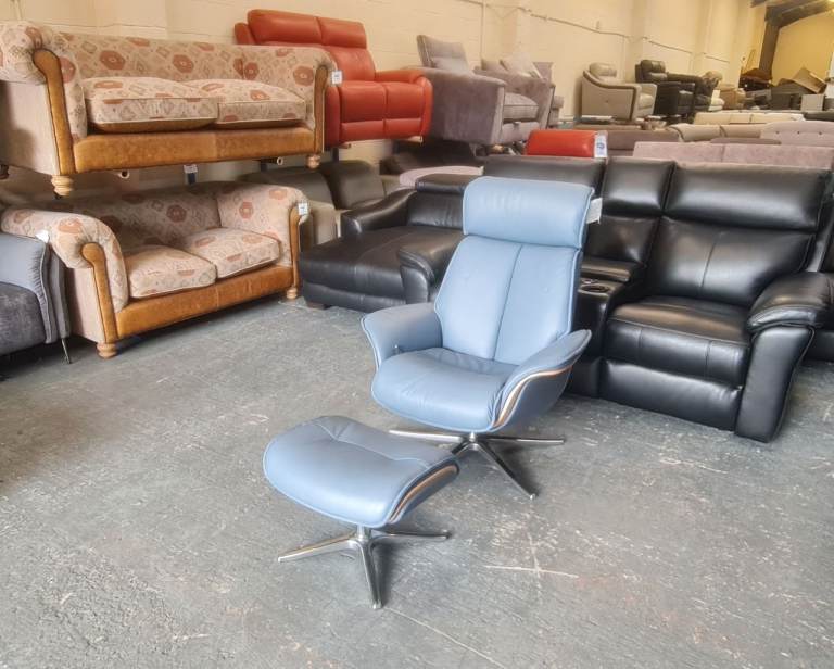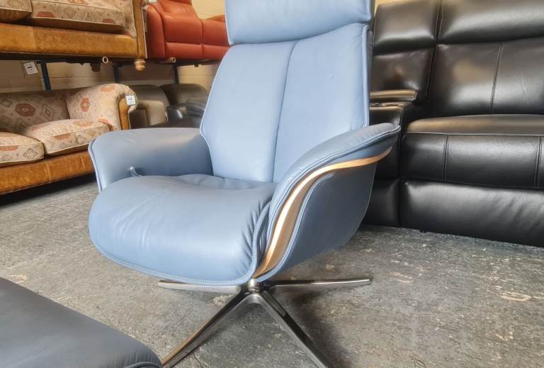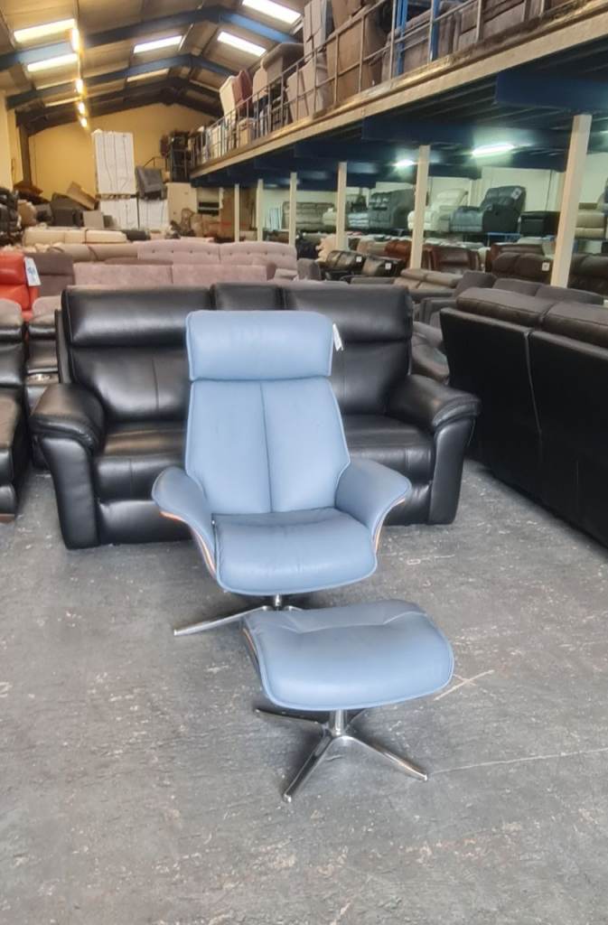 G Plan Lund cambridge sky leather recliner swivel armchair and footstool in excellent condition.