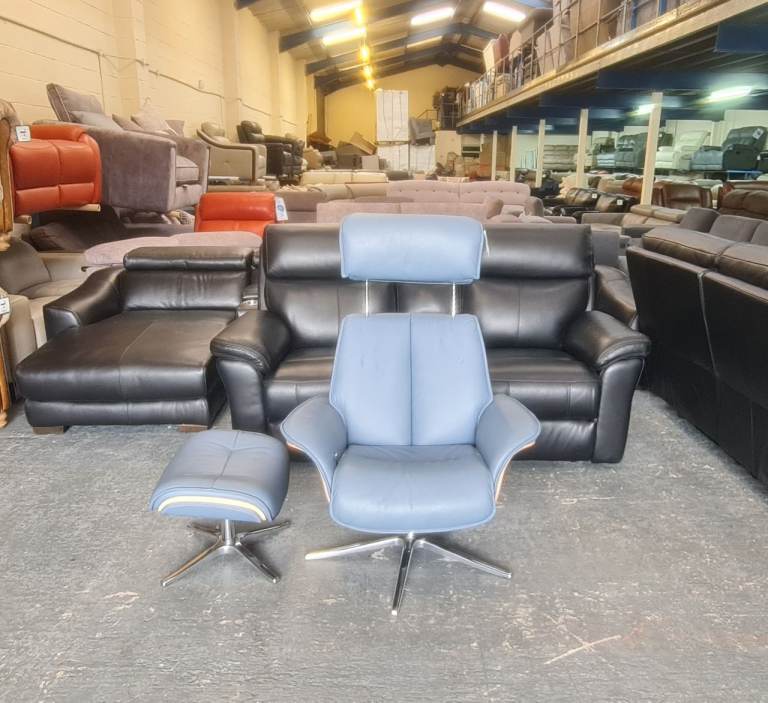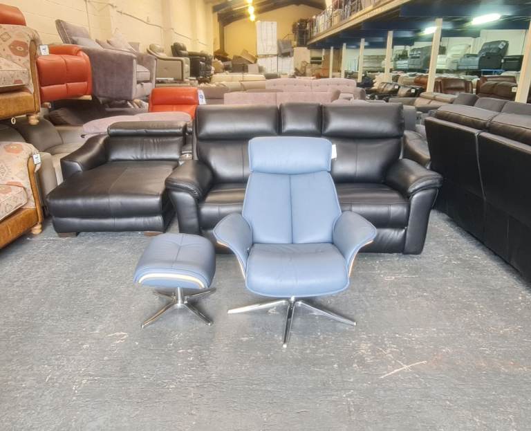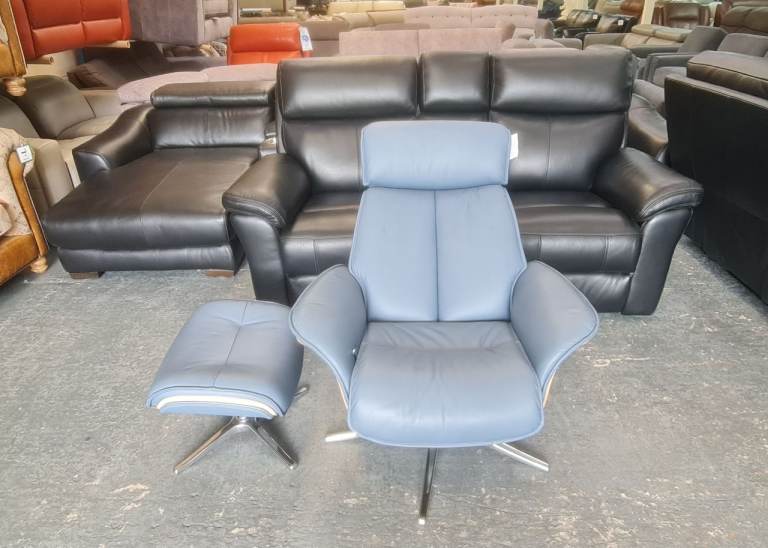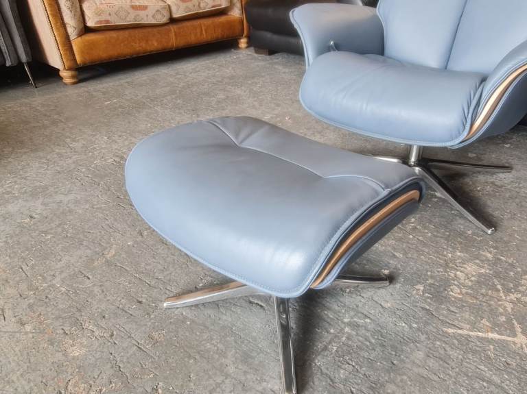 Posting for 8+ yearsG Plan Lund cambridge sky leather recliner swivel armchair and footstool